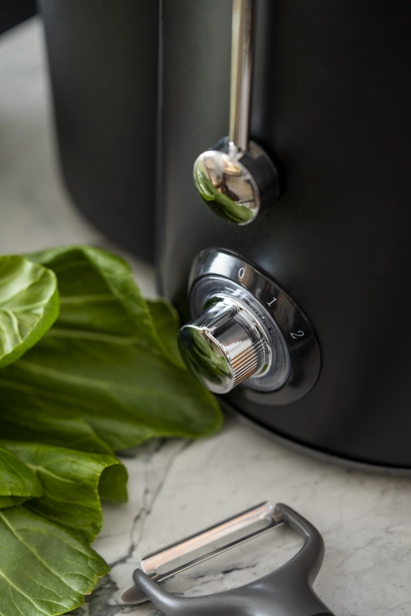 Varnostna zaklepna ročica preprečuje zagon nepravilno sestavljene naprave. Široka polnilna odprtina prihrani čas pri rezanju, odstranljive plastične dele pa lahko perete v pomivalnem stroju. Kompaktna, moderna zasnova s kovinskim izlivalnikom in vrtljivim gumbom se odlično poda na vsako kuhinjsko pultno površino.