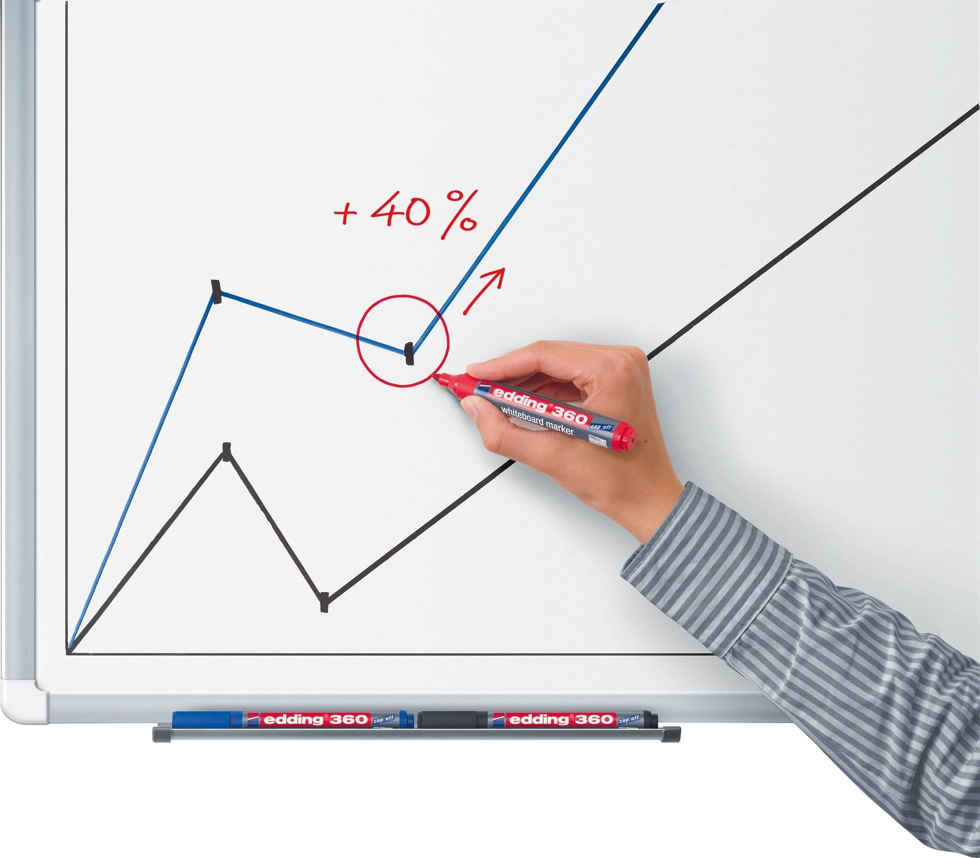 Zanesljiv marker Edding 360 je idealen za vsakodnevno uporabo v pisarni, šoli in doma. Njegovo pigmentno črnilo s šibkim vonjem je brez butilacetata, zagotavlja visoko prekrivnost in pušča jasno modro sled. Primeren je za vse vrste belih tabel, pa tudi za druge neporozne površine, kot so steklo, emajl ali melamin.