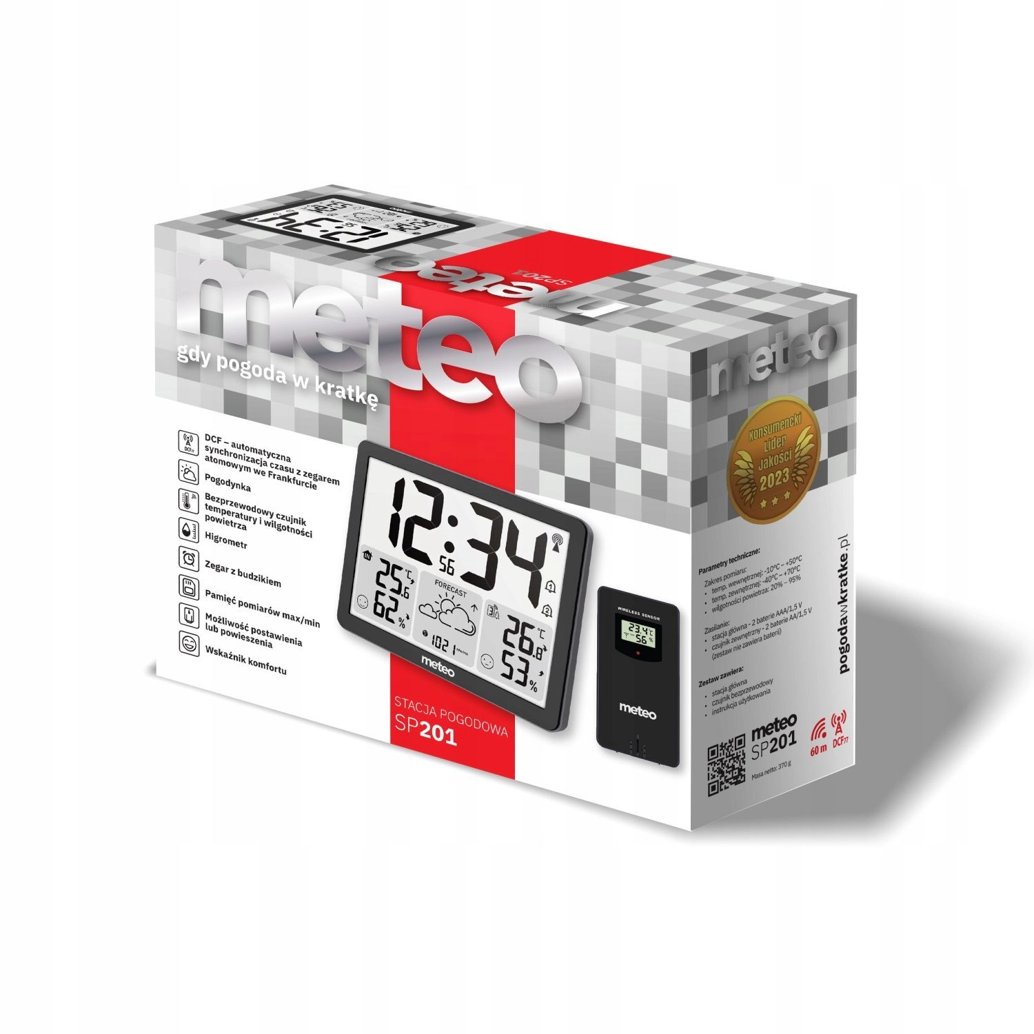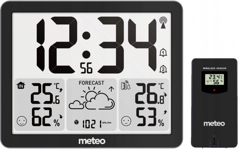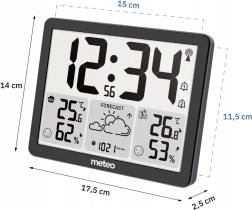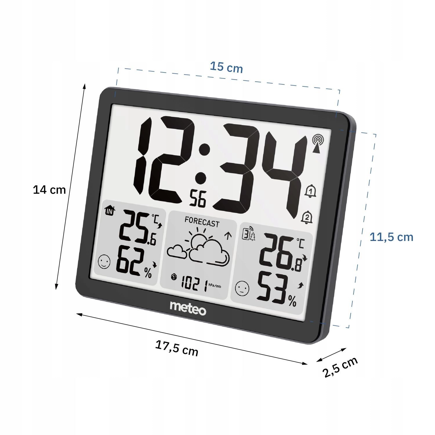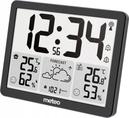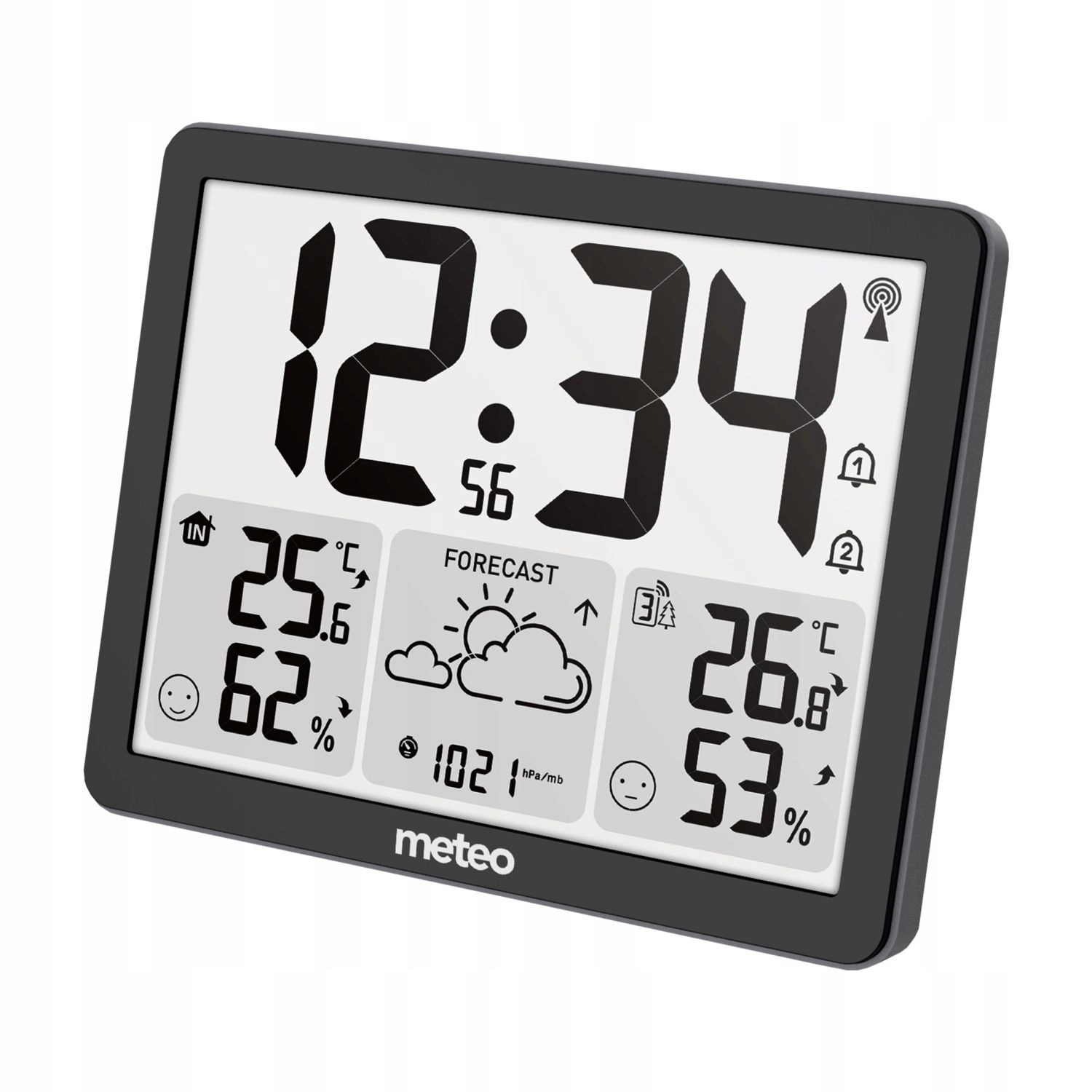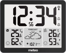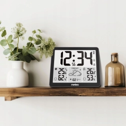Praktična digitalna vremenska postaja METEO z natančnim radijsko vodenim časom DCF prikazuje notranjo in zunanjo temperaturo ter vlažnost, barometrični tlak in vremensko napoved z ikonami. Ne manjka pomnilnik minimumov in maksimumov, kazalniki udobja in trenda ter budilka – idealno za vsakodnevni pregled klime doma in na prostem.