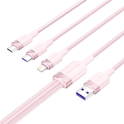 Vsestranskost na prvem mestu: en kabel, trije konektorji – USB‑C, Lightning in Micro‑B. Polnite in sinhronizirajte različne naprave brez iskanja pravega kabla. Vgrajeni čip pametno razporeja energijo med priključenimi konektorji, s čimer zagotavlja optimalno in varno polnjenje brez pregrevanja in prenapolnjevanja.
