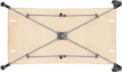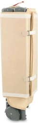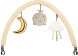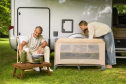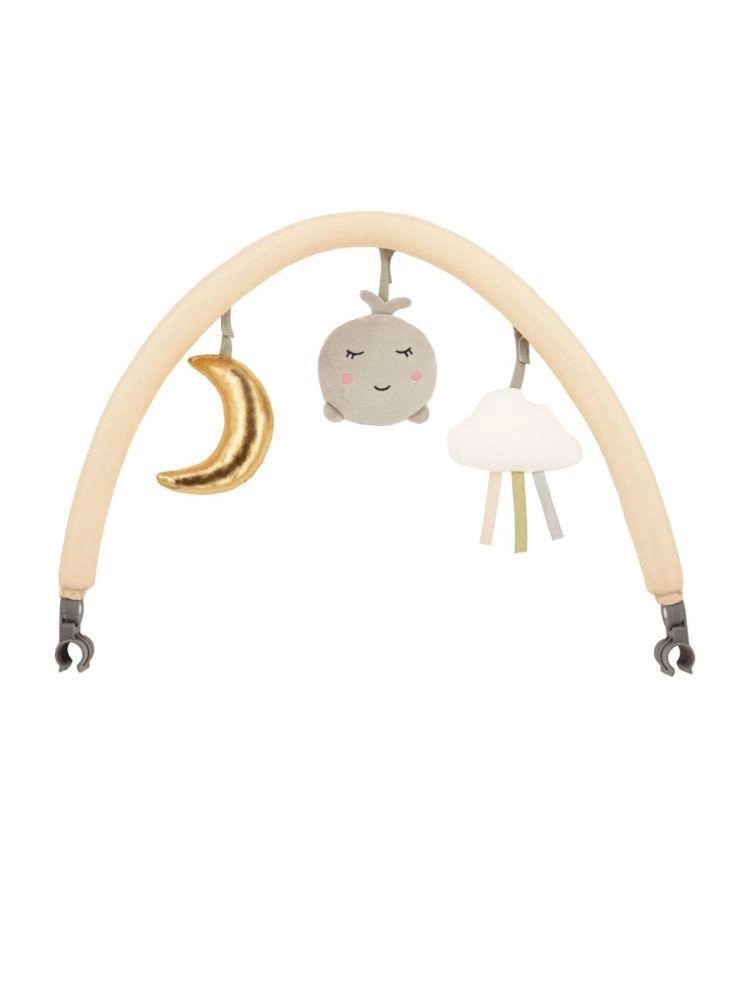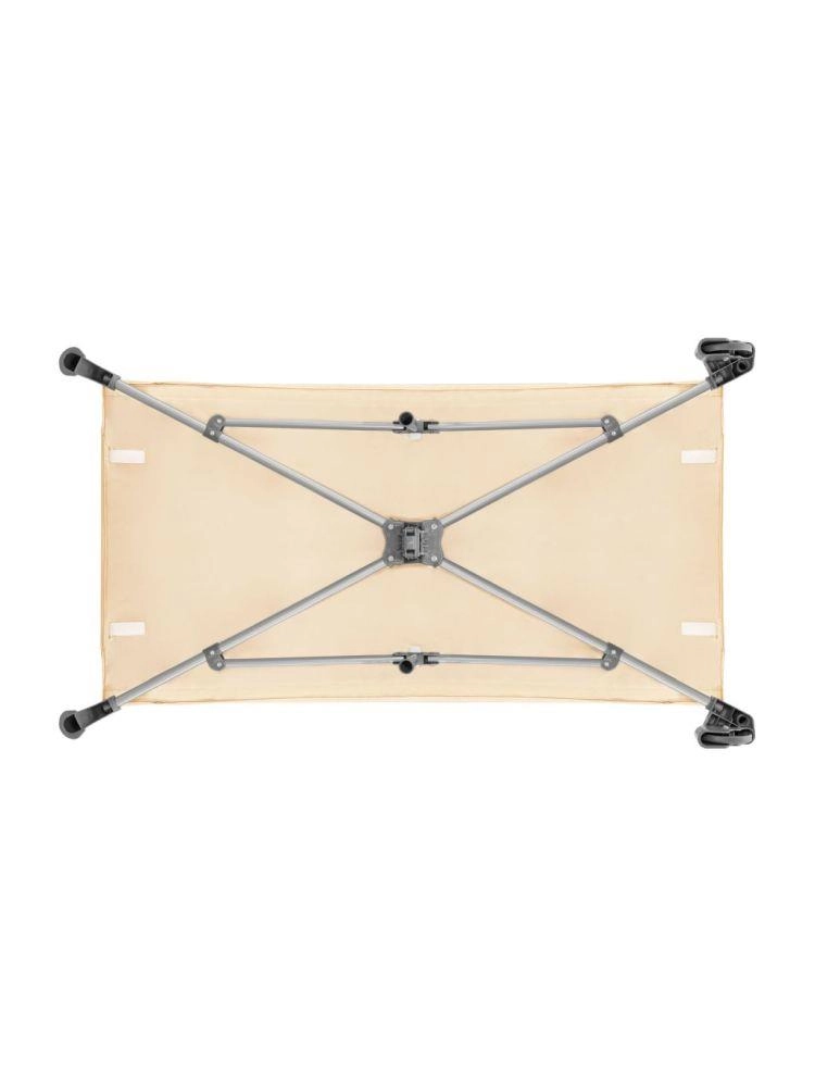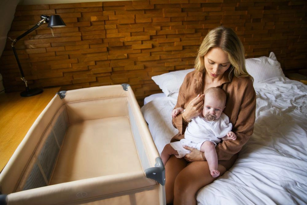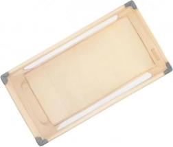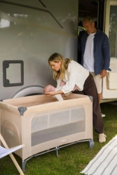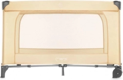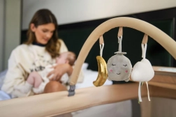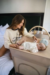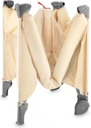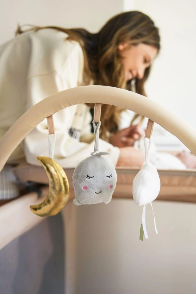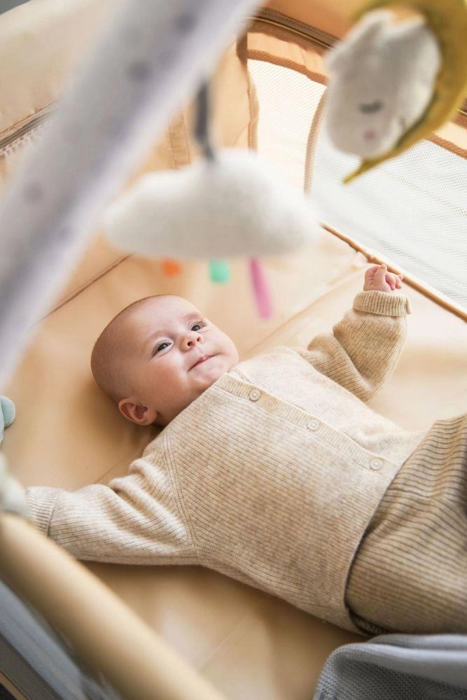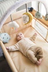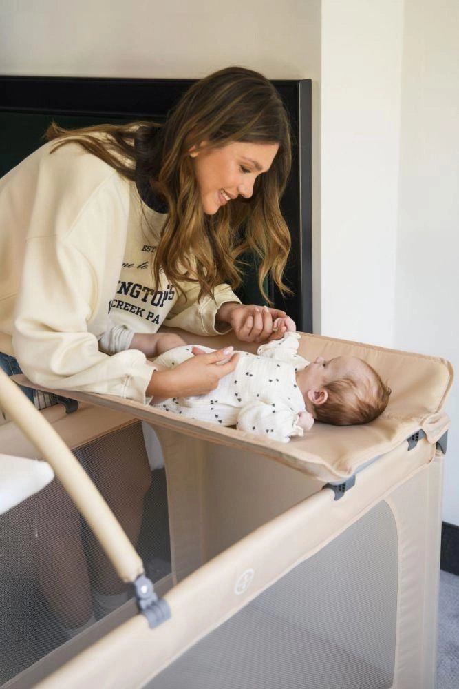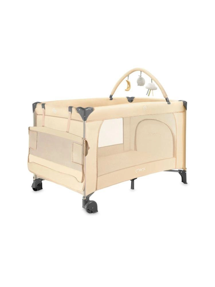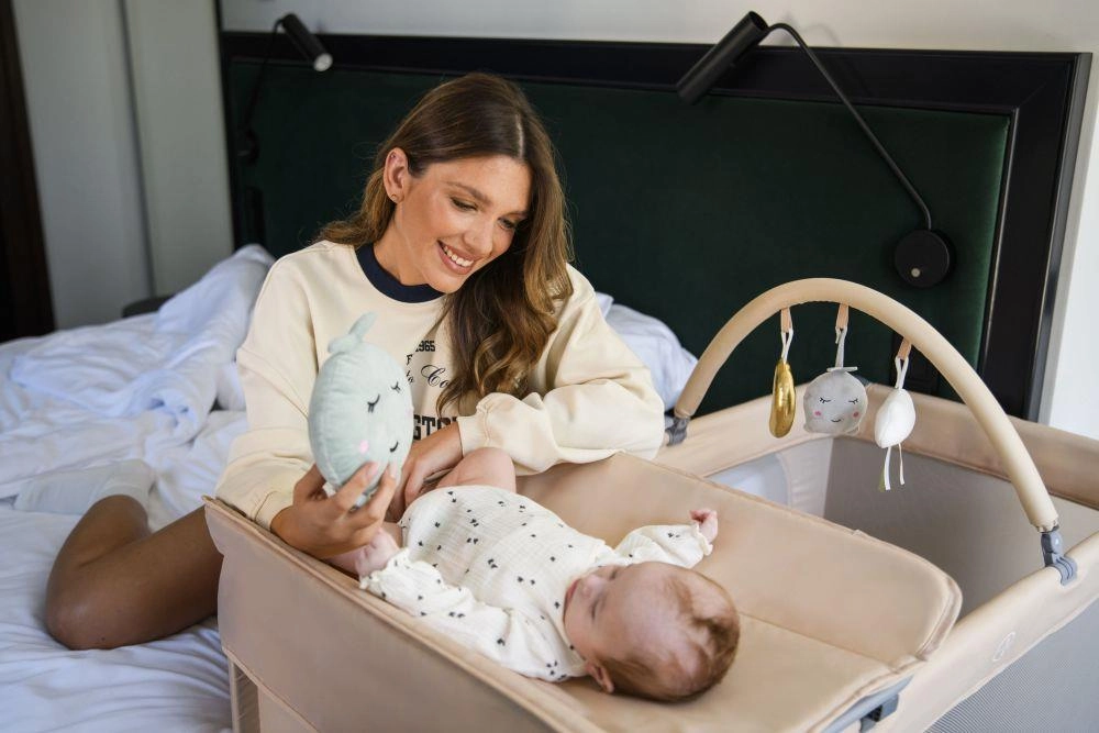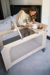 Posteljica ponuja dve ravni spanja: zgornje ležišče za dojenčke do 9 kg in spodnje za malčke do 15 kg. Ne manjka stranski vhod na zadrgo za samostojno plazenje, kolesca za lahek premik in zaklep okvirja proti nenamernemu zlaganju. Del kompleta so vzmetnica, lok z igračkami za razvoj čutov in previjalna miza za udobno nego.