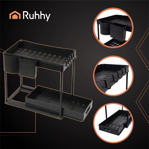 Praktični dvonadstropni organizator Ruhhy maksimalno izkoristi prostor pod koritom, v shrami ali kopalnici. Izvlečne police omogočajo, da zlahka dosežete čistila, gobice ali kozmetiko brez prelaganja drugih stvari. Stabilen kovinski okvir in kakovosten PP plast zagotovita dolgo življenjsko dobo tudi v okolju s povišano vlago.