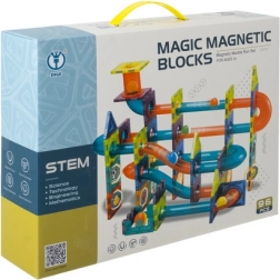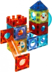 Magnetne kocke in elementi za stezo iz trpežne plastike ABS se zaradi močnih magnetov zlahka in stabilno spajajo. Otroci lahko gradijo ploščate in prostorske konstrukcije, stolpe, mostove in predvsem kreativne kroglične steze s tuneli, ovinki in skledami. Prozorne barve spodbujajo zaznavanje oblik in barv ter vabijo k raziskovanju.