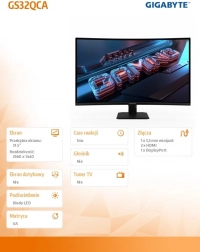 GIGABYTE GS32QCA prinaša idealno kombinacijo gladkosti in podrobnosti za tekmovalne in pripovedne igre. Ukrivljen VA panel z ločljivostjo QHD nudi bistveno večjo ostrino kot Full HD, medtem ko frekvenca 180 Hz in hiter odziv zmanjšujeta zameglitev gibanja in trganje slike.