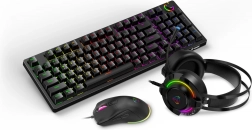 Vstopite v igro s celovitim kompletom 3 v 1, ki združuje mehansko RGB tipkovnico, RGB igralno miško s senzorjem PixArt in RGB slušalke z samodejno nastavljivim naglavnim trakom. Idealno za igralce, ki želijo zmogljivost, natančnost in stilno osvetlitev v enotnem dizajnu.