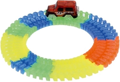 Sestavite si svojo svetlečo dirkalno stezo in pošljite na progo hitri avtomobilček! Prilagodljive dele lahko zlahka upogibate v različne oblike; steza ima 57 delov dolžine 72 cm, avtomobilček s 3 utripajočimi lučkami pa deluje na 1× AA baterijo (ni priložena). Idealno za otroke od 3 let – zabava, ustvarjalnost in razvoj fine motorike.