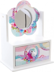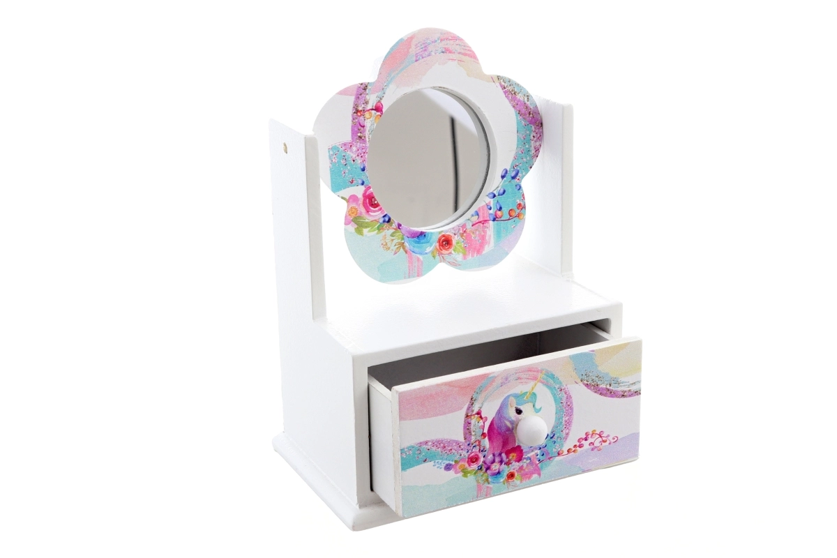 Ta očarljiva lesena škatlica za nakit s cvetličnim ogledalcem bo razveselila vsako malo gospodično. Zaradi ljubkega dizajna s samorogom je ne le čudovita dekoracija, temveč tudi praktičen prostor za shranjevanje drobnega nakita in zakladkov.