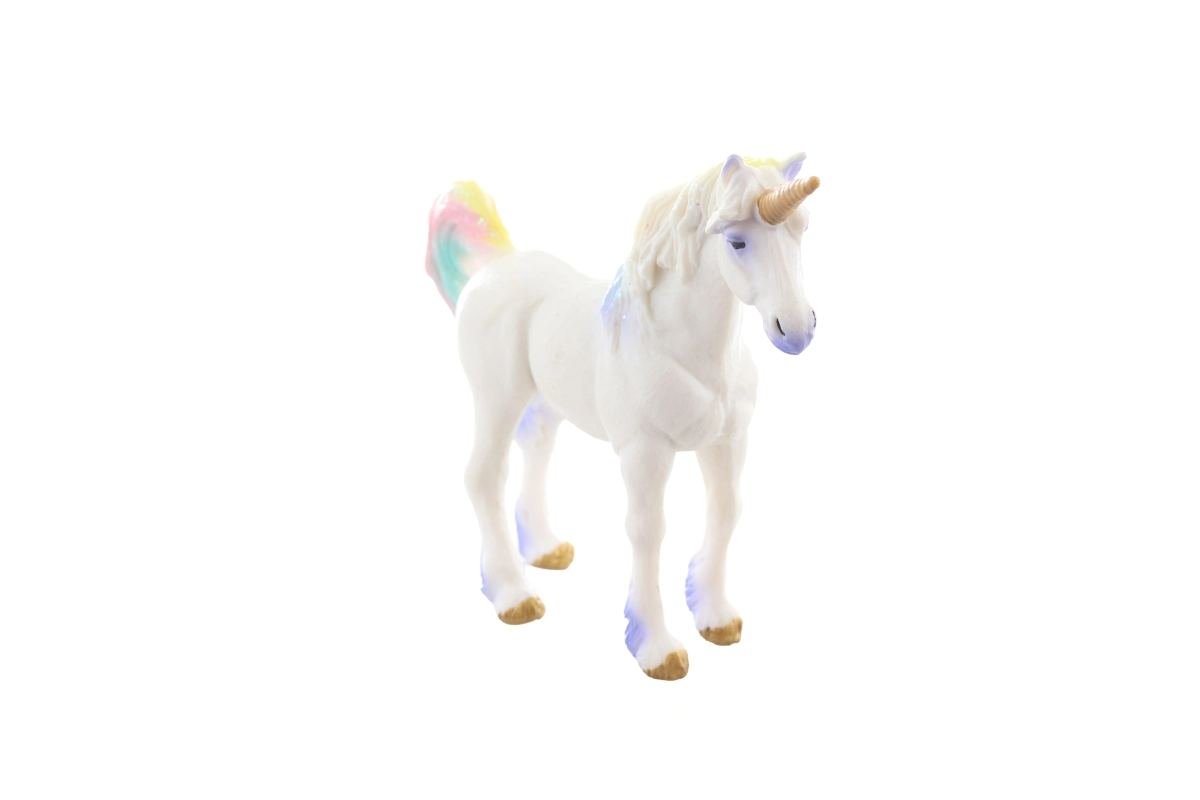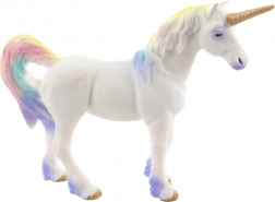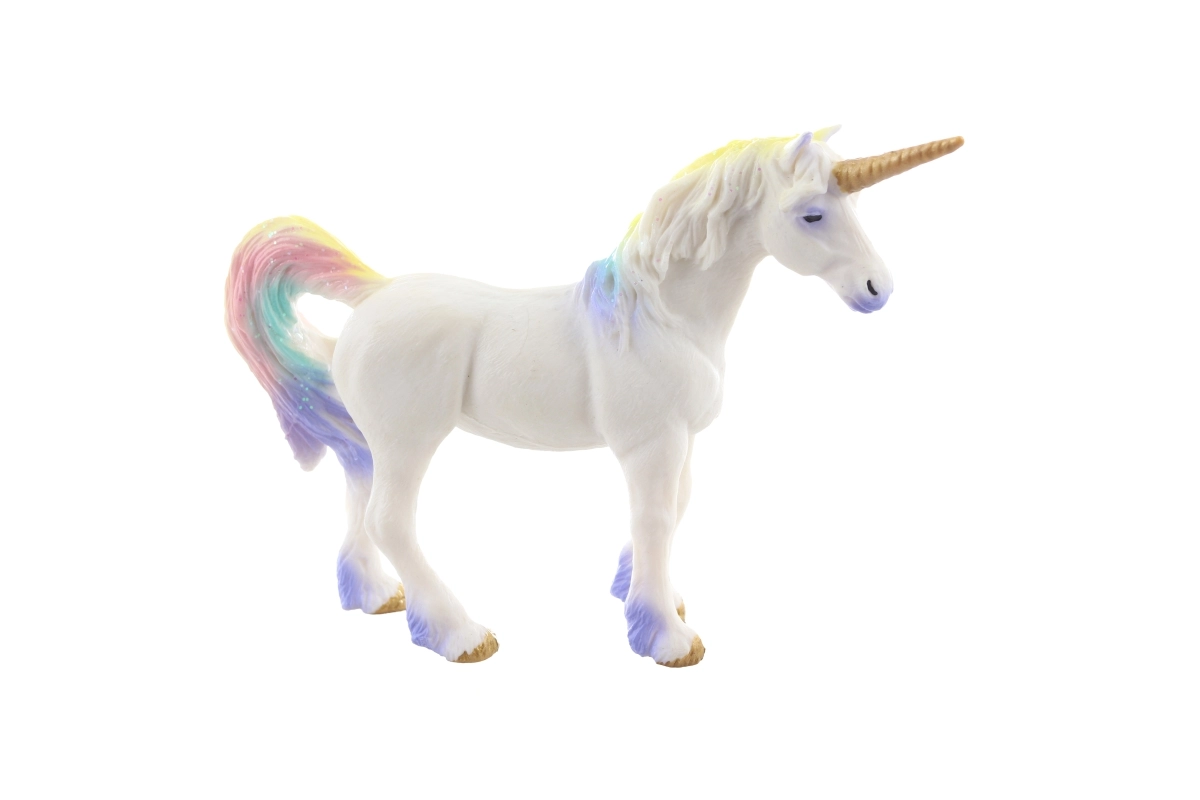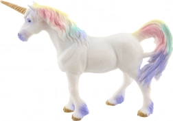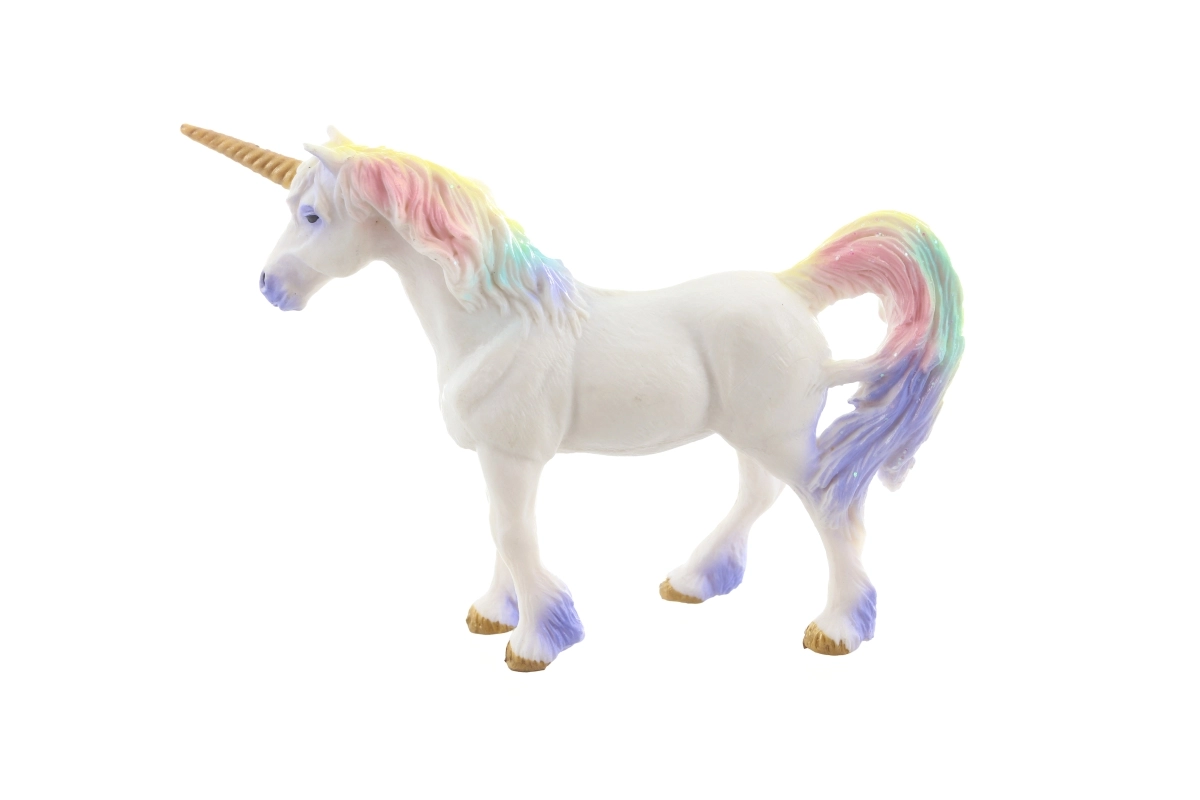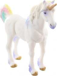 Ta eleganten samorog v belem videzu z zlatim rogom in pastelno mavrično grivo očara z realističnim oblikovanjem in nežnimi barvnimi poudarki. Odličen je za domišljijske igre, pripovedovanje zgodb in kot dekoracija otroške sobe.