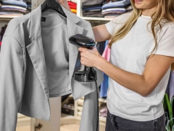 Urejajte oblačila kar na obešalniku. Zložljiv ročaj prihrani prostor in napravo naredi idealno za dom in potovanja.
