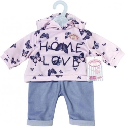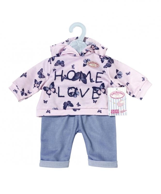 Privoščite svoji punčki BABY ANNABELL prijeten domači outfit. Set ponuja dva različna videza: rožnat pulover s kapuco z nežnimi metuljčki in hlače v džins stilu ali moder pulover s kapuco z ljubko sličico ter udobne športne hlače. Materiali so mehki in prijetni na dotik, idealni za vsakodnevno igro.