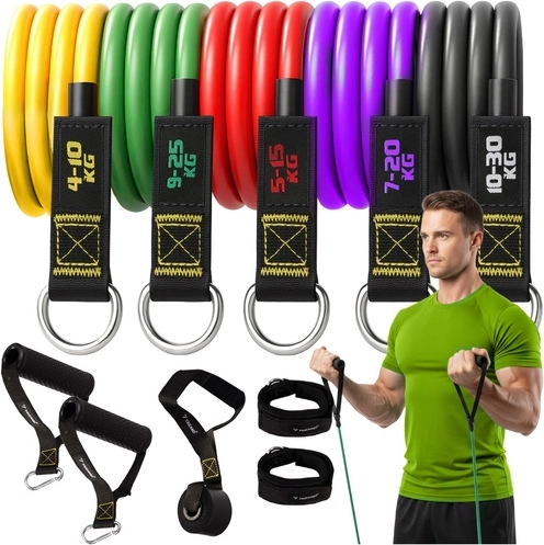 Popoln komplet odpornih elastik TRIZAND za učinkovito vadbo doma in v telovadnici. Vsebuje 5 trakov z uporom 4–30 kg, ročaje za roke, trakove za gležnje, vratno sidro za vrata in etui. Zahvaljujoč odpornemu lateksu, visoki elastičnosti in nedrsečim ročajem lahko varno vadite celotno telo – hrbet, roke, noge, trebuh in zadnjico.