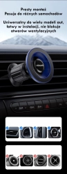 Montaža tipa hook z vijakom za nastavitev trdno zasidra nosilec v reži in preprečuje njegovo popuščanje ali izpadanje. Namestitev je hitra, brez orodja in združljiva z večino avtomobilov. Zahvaljujoč univerzalni magnetni površini zanesljivo drži telefone različnih velikosti, vključno s tistimi v zaščitnem ovitku.