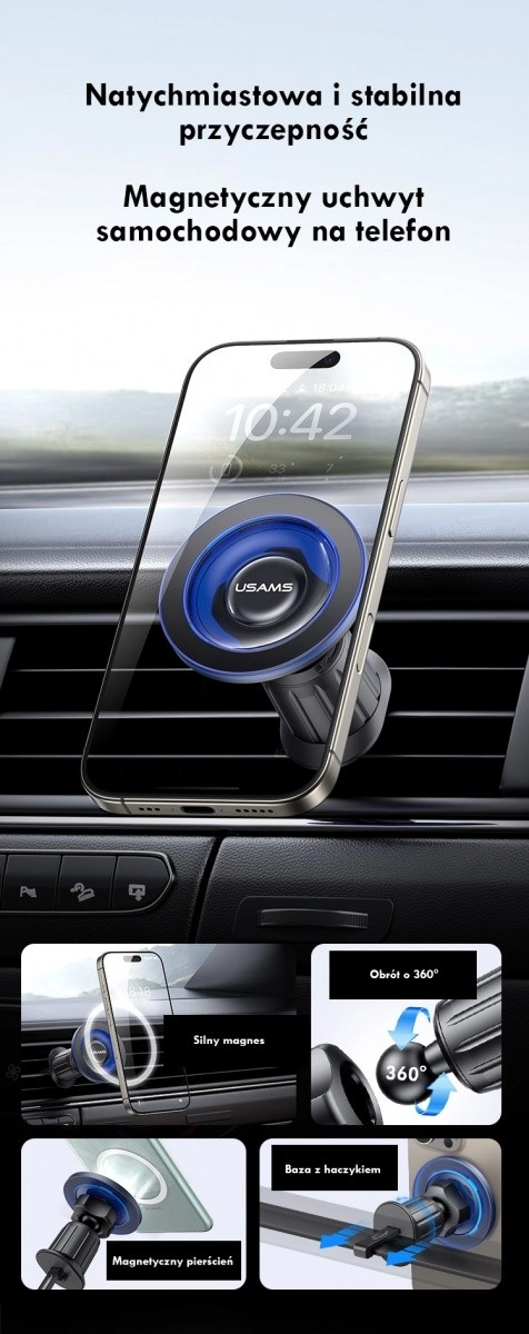 USAMS ZJ081 združuje trpežne materiale (akril in silikon) s premišljeno ergonomijo. Močni magneti s sistemom samodejnega centriranja zagotavljajo stabilno pritrditev telefona, medtem ko kroglasti sklep omogoča gladko nastavitev v pokončnem in ležečem načinu. Kompaktne dimenzije ne ovirajo kabine in ne obremenjujejo zračne reže.