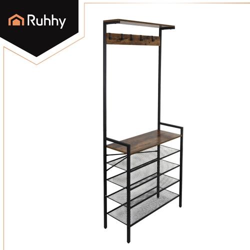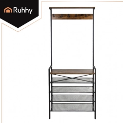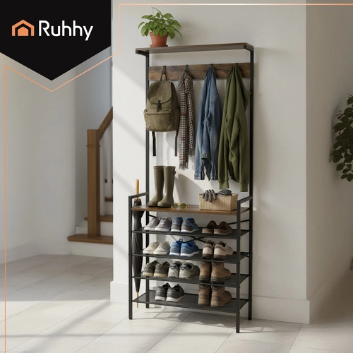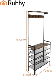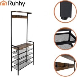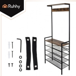 Uredite jakne, obutev in dodatke na enem mestu. Predsobočni stojalo RUHHY v industrijskem slogu združuje trpežno kovinsko konstrukcijo z naravnim videzom lesa. Zahvaljujoč mrežastim policam čevlji bolje dihajo in hitreje sušijo, zgornja polica sprejme kape ali šale, kljuke pa poskrbijo, da so plašči in torbe vedno pri roki.