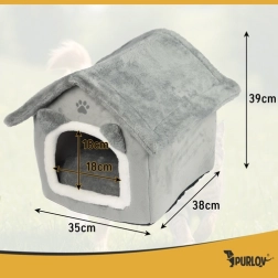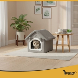 Hišica Purlov je idealna skrivališče in udoben prostor za poležavanje. Mačka se lahko skrije v notranjost za miren spanec ali se udobno namesti na vrh. Plišast material ponuja toplino in udobje skozi vse leto, medtem ko lahka konstrukcija zagotavlja prijetno zračnost v toplejših mesecih.