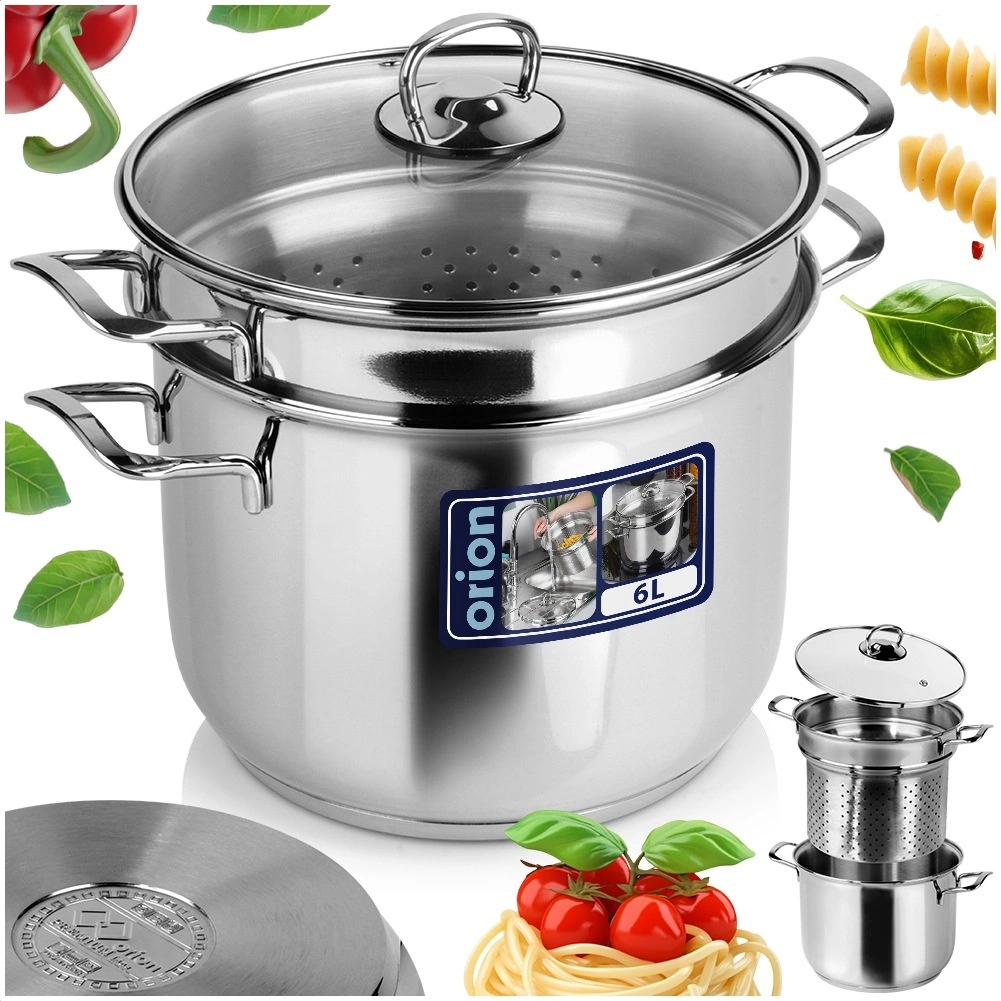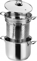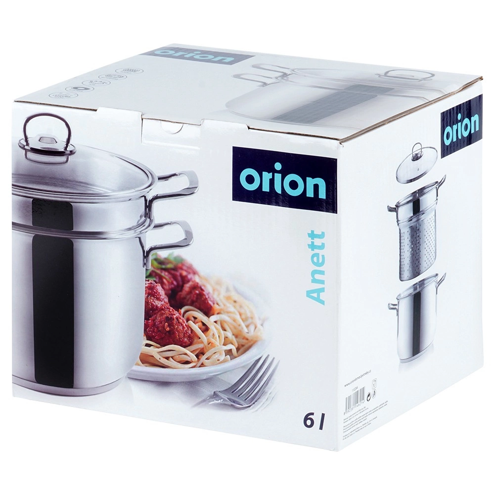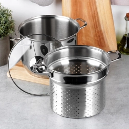 Odkrijte vsestranski 3-delni set ANETT: prostoren 6-lonec, perforiran vložek za kuhanje in cejenje ter steklen pokrov z odprtino za izpust pare. Robustna konstrukcija iz poliranega nerjavnega jekla je trpežna, enostavna za čiščenje in odlično dopolni moderno kuhinjo. Zahvaljujoč vložku lahko testenine ali zelenjavo skuhate in odcedite brez dodatnega cedila.