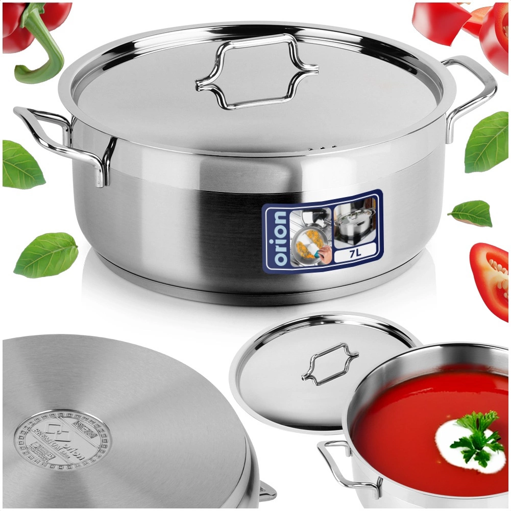 Premium nerjavni lonec Anett 7 l za vsakodnevno kuhanje in dušenje na vseh vrstah štedilnikov, vključno z indukcijo. Ima mogočne stene, večslojno akutermično dno za enakomerno porazdelitev toplote in je dobavljen s kakovostnim nerjavnim pokrovom. Primeren za pomivalni stroj in idealen za domače ter profesionalne kuhinje.