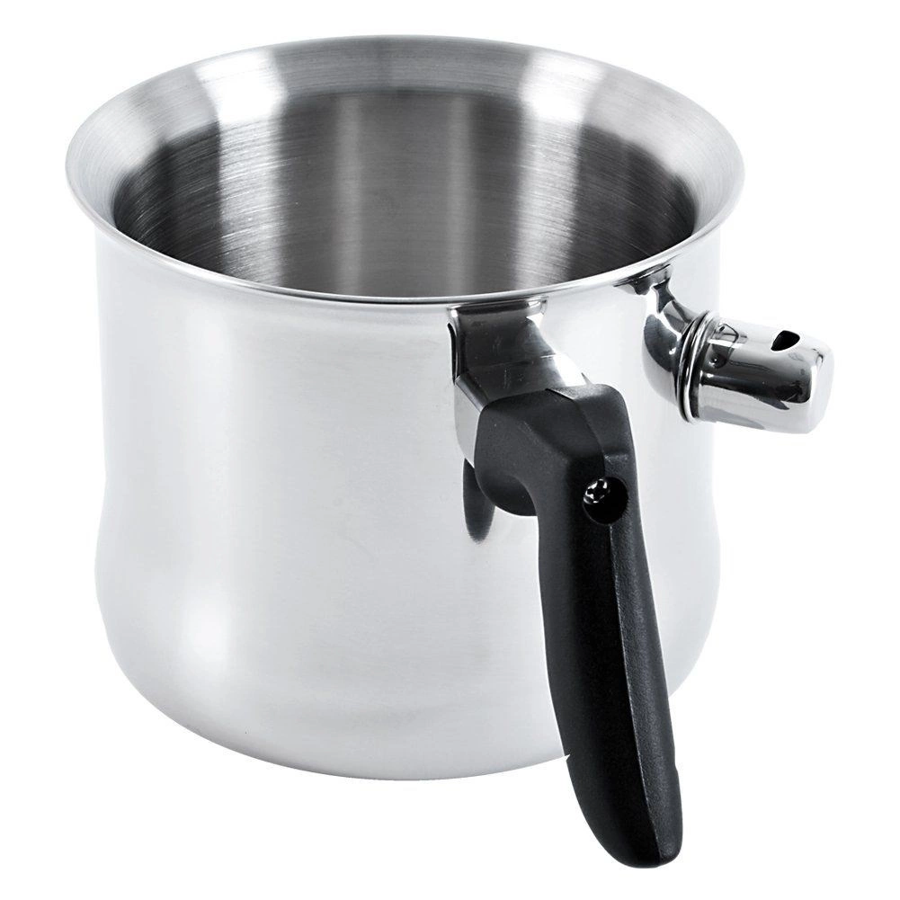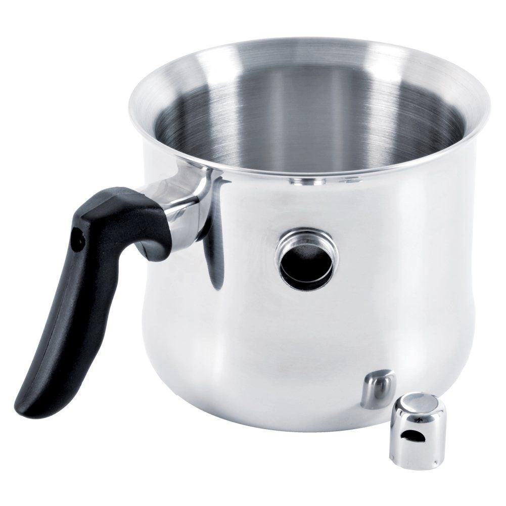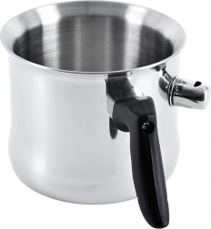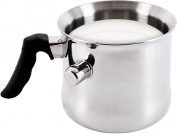 Ta lonec za mleko z dvojno steno in vodnim plaščem je odlična izbira za nežno segrevanje mleka, čokolade, pudingov ali občutljivih omak. Dovolj je, da odvijete piskač, v plašč nalijete vodo in kuhate – ko je mleko pripravljeno, ventil zapiska. Ergonomski ročaj v črni barvi lepo leži v roki in zagotavlja varno rokovanje.