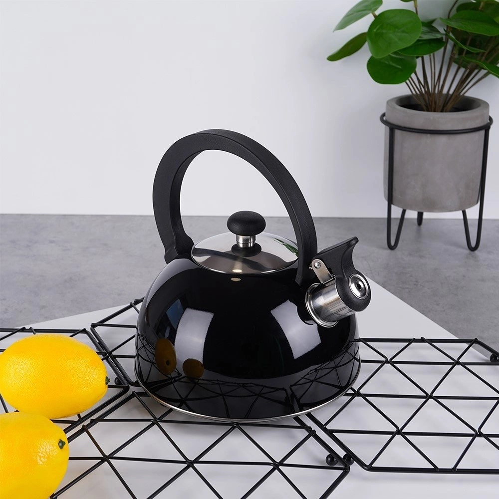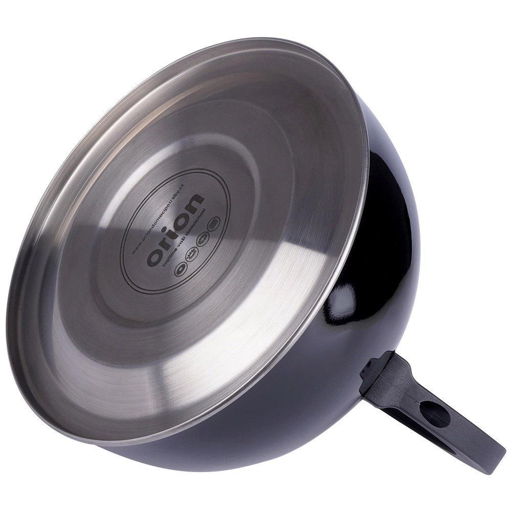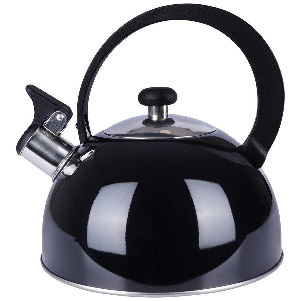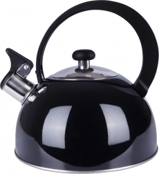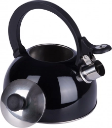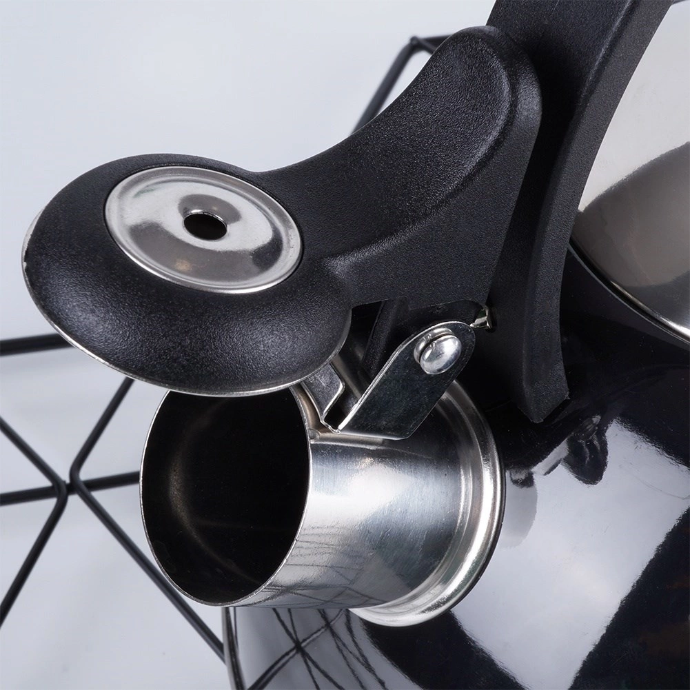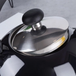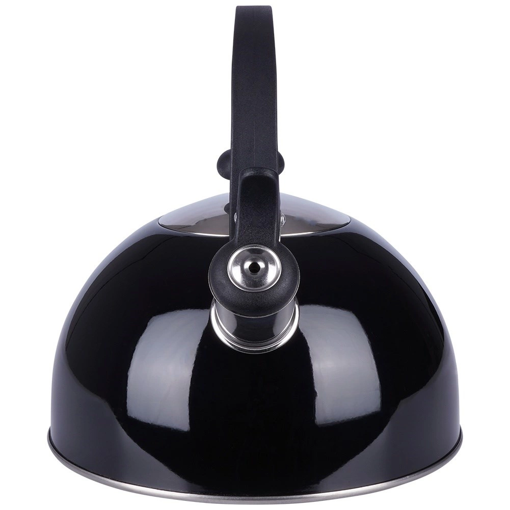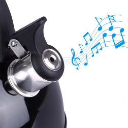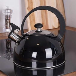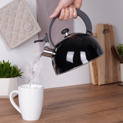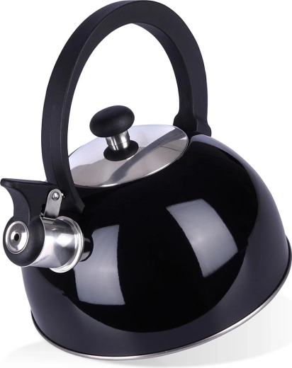 Slogoven grelnik vode s piščalko v bleščeče črni izvedbi združuje odporno nerjavno jeklo in praktičnost za vsakodnevno uporabo. Široko dno zagotavlja učinkovit segrevalni učinek, piščalka pa zanesljivo opozori na vrelišče.