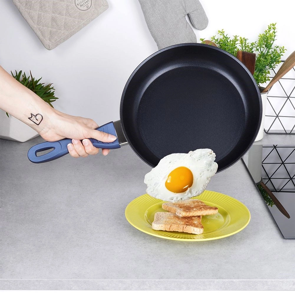 Odporna konstrukcija iz aluminijastega ulitka je stabilna, masivna in pripravljena tudi na intenzivno vsakodnevno kuhanje. Ponev je brez PFOA in PTFE, obvlada kuhanje z malo maščobe, dušenje in pripravo palačink. Ergonomski ročaj z mehkim silikonom nudi udoben oprijem in se ne segreva.
