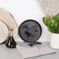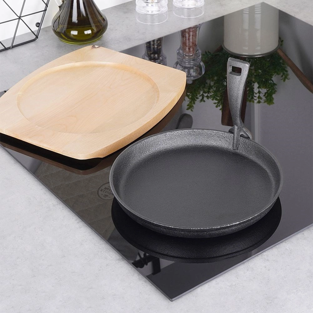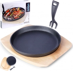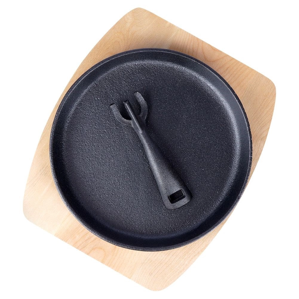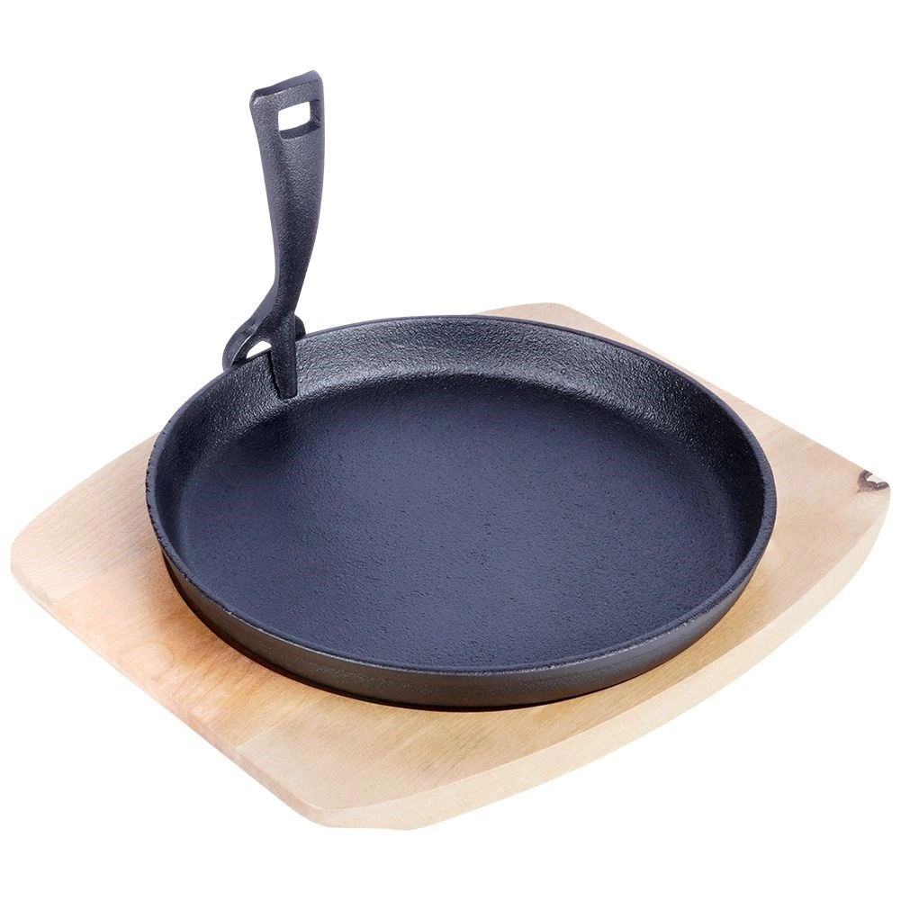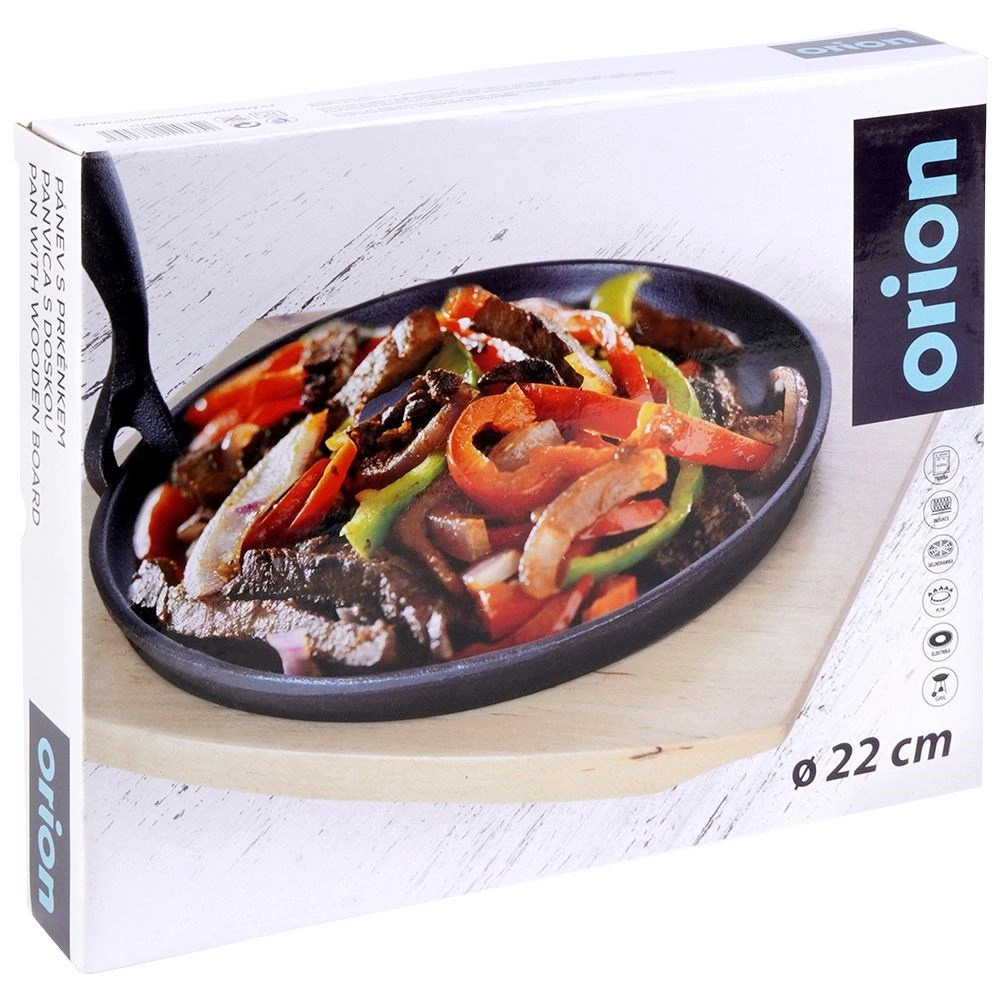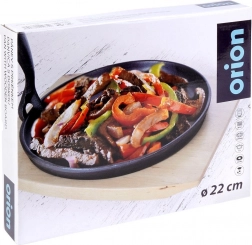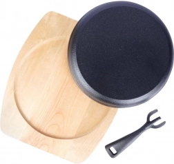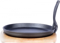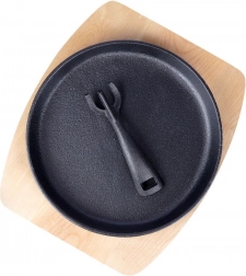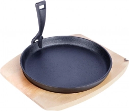 Univerzalna litoželezna ponev za vsakodnevno kuhanje in atraktivno postrežbo neposredno na mizi. Masivno litoželezo se hitro in enakomerno segreje, dolgo zadržuje temperaturo in ohranja jedi tople tudi med postrežbo. Priložena je trdna lesena deska, ki ščiti površine pred vročino in olajša prenašanje.