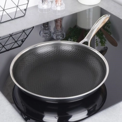 Zaradi posebne strukture površine ponev dosega višjo toplotno učinkovitost, zato se hitro segreje in ohranja enakomerno temperaturo. To prihrani energijo in čas ter hkrati pomaga ohraniti pristni okus in hranilne snovi v sestavinah. Ergonomski ročaj zagotavlja udobno in varno uporabo, kuhate pa lahko tudi z minimalno količino maščobe.
