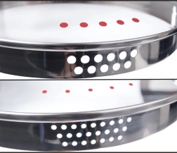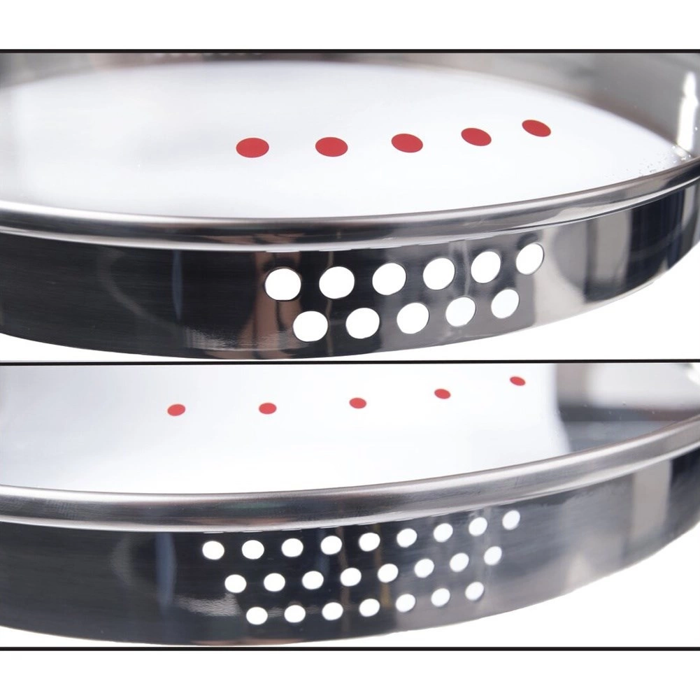 Praktičen steklen pokrov s perforiranim robom zadrži sestavine v loncu in omogoča varno ter udobno odlivanje vode brez cedila.