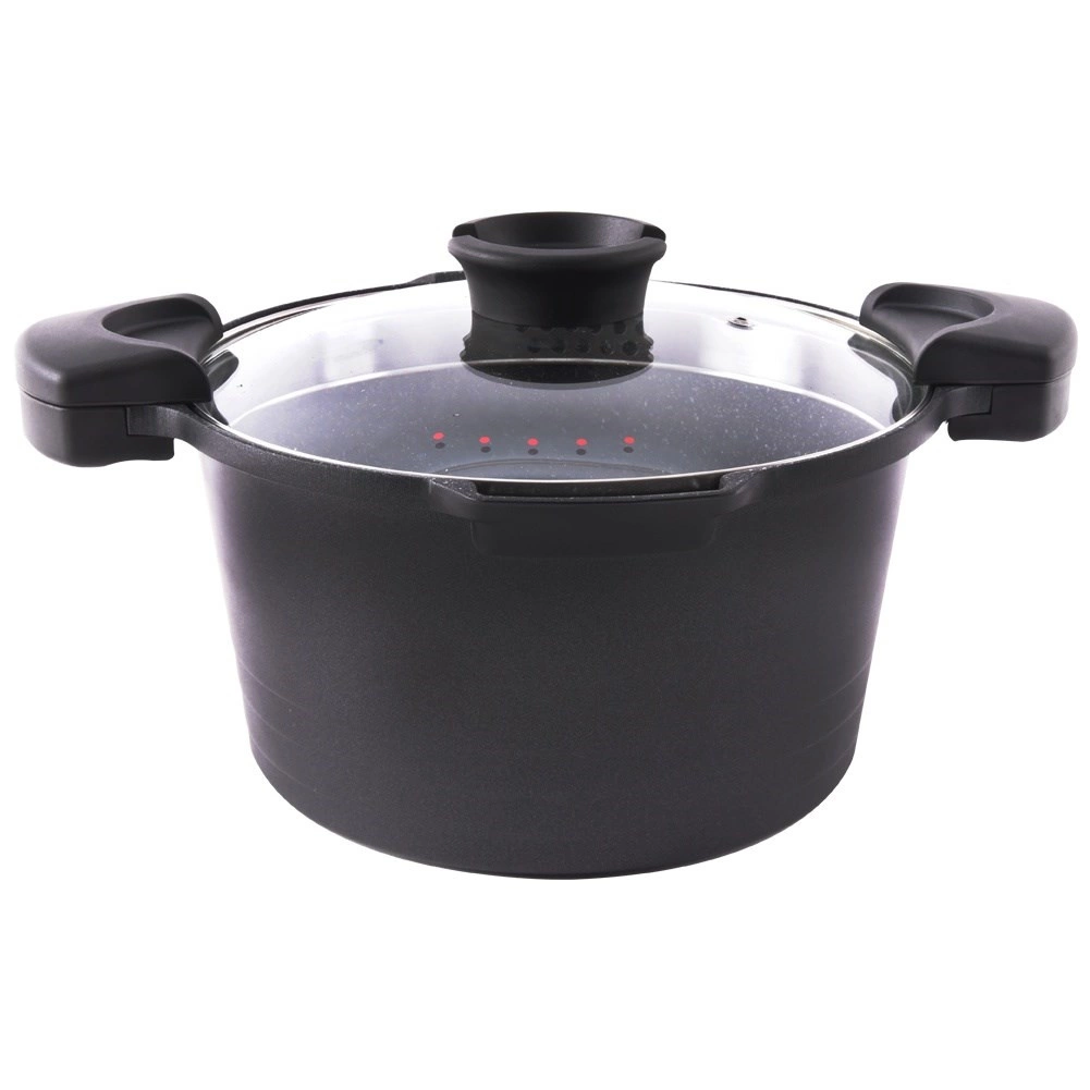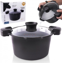 Eleganten in trpežen lonec iz linije ORION GRANDE združuje sodoben videz z visoko funkcionalnostjo. Granitni nelepljivi premaz je odporen proti praskam in olajša kuhanje z minimalno količino maščobe. Steklen pokrov s perforiranim robom omogoča udobno cejenje neposredno iz lonca, zato prihranite čas in posodo.