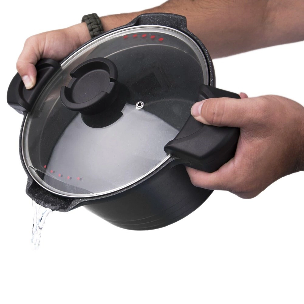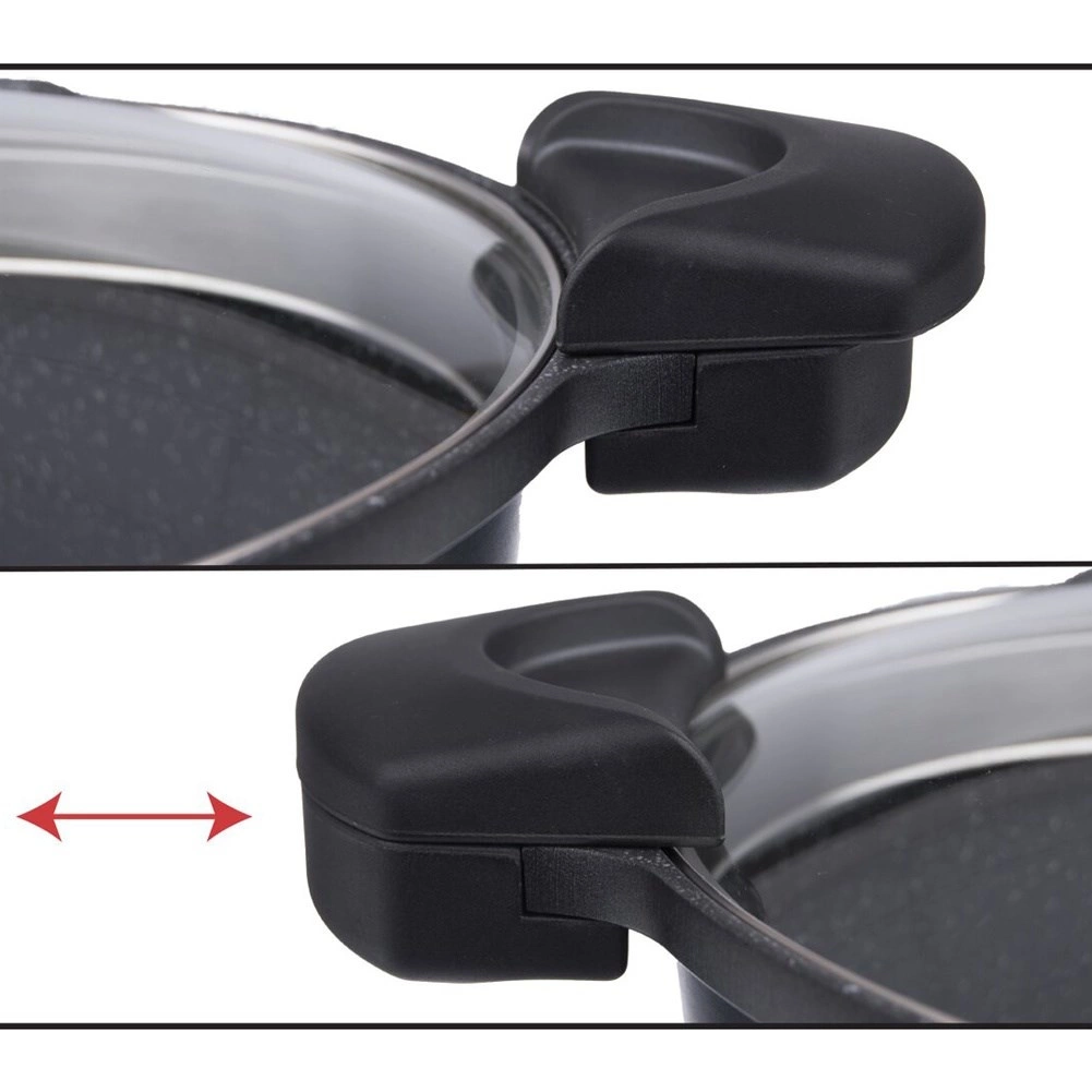 Ergonomski, na toploto odporni ročaji ter izlivi na telesu lonca omogočajo zanesljiv oprijem in nadzorovano cejenje.
