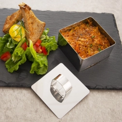 Ta kvadratni model iz kakovostnega nerjavnega jekla s praktičnim potiskovalom vam omogoča, da jedi servirate v slogu restavracije. Z njim zlahka ustvarite urejene plasti in porcije – od desertov, preko solat, do prilog, krompirja ali riža. Gladke stene zagotavljajo čisto odstranitev oblike brez razcefranih robov.