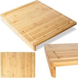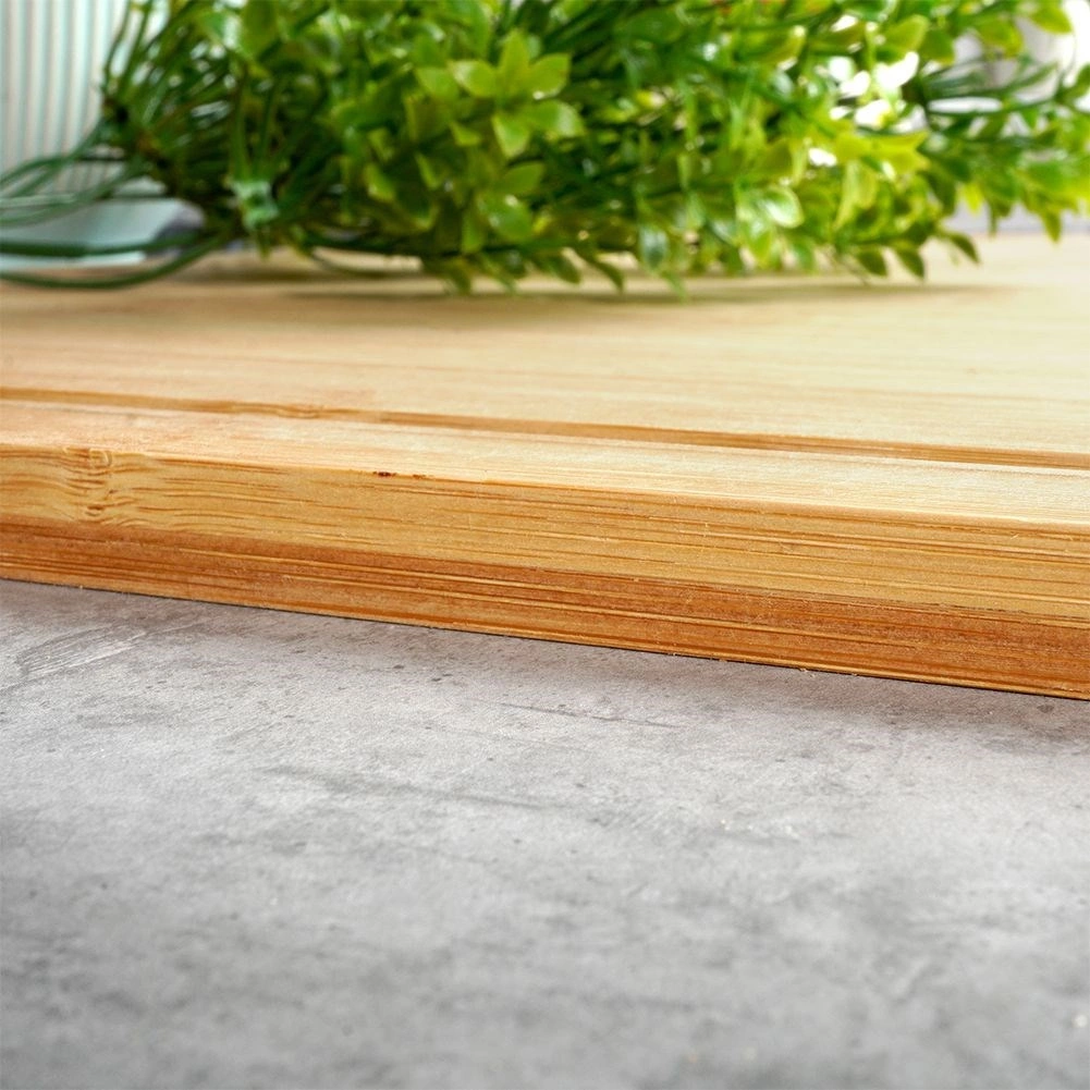 Robustna bambusova deska z L‑robnikom je idealna za rezanje mesa, zelenjave in peciva, zaradi velike površine pa odlično služi tudi kot delovna plošča za testo pri valjanju ali pripravi cmokov in pirohov. Bambus je okolju prijazen, odporen na vlago in deformacije, ne vpija vonjav in hitro se suši.