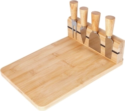 Ta stilska bambusova deska za sire spremeni vsak družabni trenutek v gurmansko doživetje. Štiri nerjaveča orodja z lesenimi ročaji so pregledno shranjena v magnetnem držalu, zato so vedno pri roki in ne zasedajo prostora na površini deske. Zahvaljujoč protidrnim nogicam deska ostane stabilna na mizi tudi pri rezanju trših sirov.