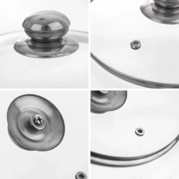 Steklen pokrov 16 cm je praktičen pripomoček za vsakodnevno kuhanje. Prozorno, ogrevno odporno steklo olajša nadzor jedi, medtem ko parni ventil učinkovito odvaja odvečno paro. Nerjaveč rob zagotavlja vzdržljivost in tesno prileganje na posodo.