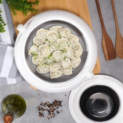 Praktični stranski ročaji in vrtljiv pokrov zagotavljajo varno rokovanje pri mizi in med prenašanjem.