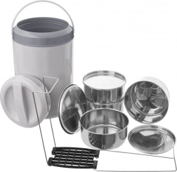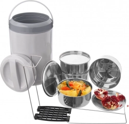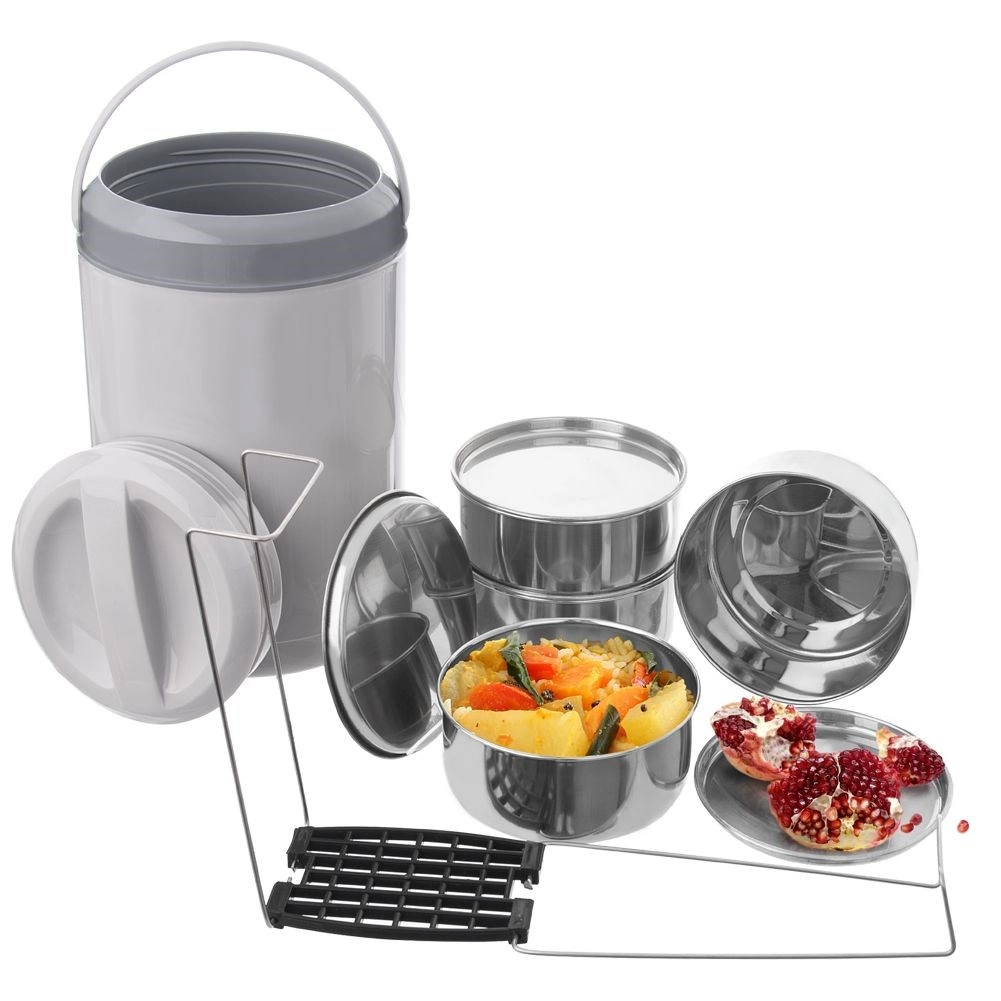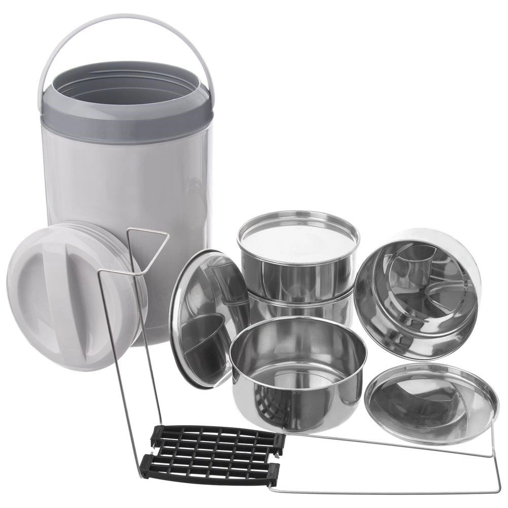 Odkrijte zanesljiv način, kako prenesti celoten meni v enem setu. Štiri samostojne posode iz nerjavnega jekla (vsaka 800 ml) z zapiralnimi pokrovi so povezane s čvrstim stojalom, ki zagotavlja stabilno in pregledno zlaganje. Sivi izolacijski ovitek z ročajem pomaga ohranjati temperaturo jedi in omogoča udobno ter varno prenašanje.