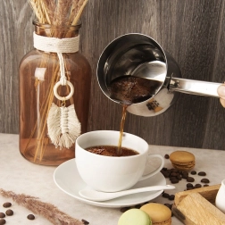 Odkrijte pristni okus turške kave z elegantnim nerjavnim lončkom s prostornino 600 ml. Zahvaljujoč robustni konstrukciji iz nerjavnega jekla zagotavlja enakomerno segrevanje, enostavno čiščenje in dolgo življenjsko dobo. Praktičen izljev omogoča natančno in čisto prelivanje, medtem ko poseben zgornji ovratnik pomaga preprečiti prelitje med vrenjem.