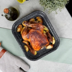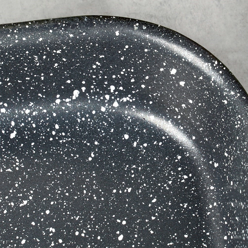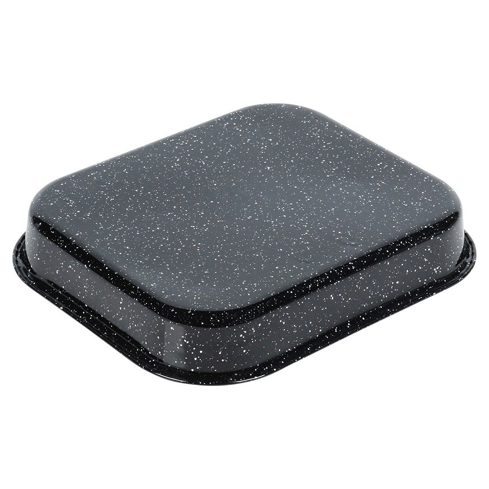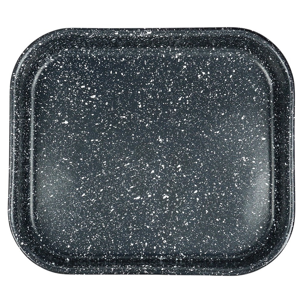 Robusten jeklen pekač z emajliranim ohišjem in granitno, visokoodporno nelepljivo površino zagotavlja enakomerno pečenje in preprosto izmetavanje jedi. Notranja mera 27 × 23 × 4 cm je odlična za peko piščanca, zelenjave, kolačev in domače pice.