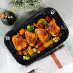 Prostornina 4,8 l in praktična globina ohranjata sokove v jedi – idealno za peko mesa in sočnih zapečenih jedi.