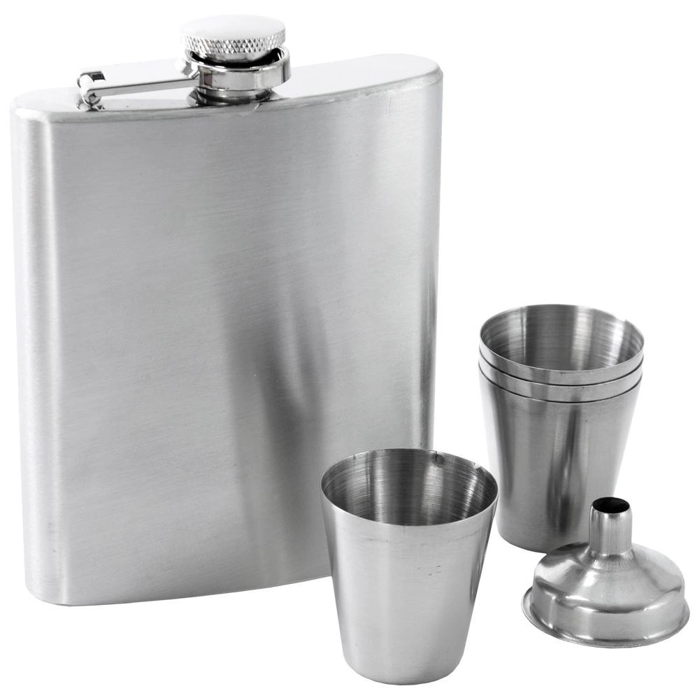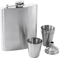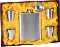 Elegantni set za ljubitelje dobrega pitja: jeklenka 210 ml z lijakom in štirimi kozarčki v darilni embalaži. Izdelana iz kakovostnega nerjavečega jekla, ki ne zadržuje vonjav in ne spreminja okusa pijače. Jeklenka ima tesnilni navojni zapirač in kompaktne mere za enostavno prenašanje – idealna za izlete in zabave. Odličen predlog za darilo.