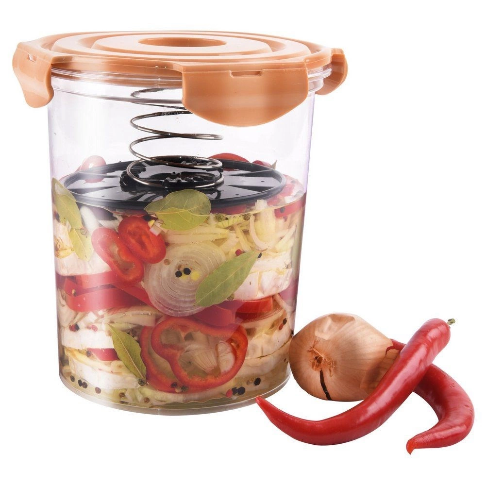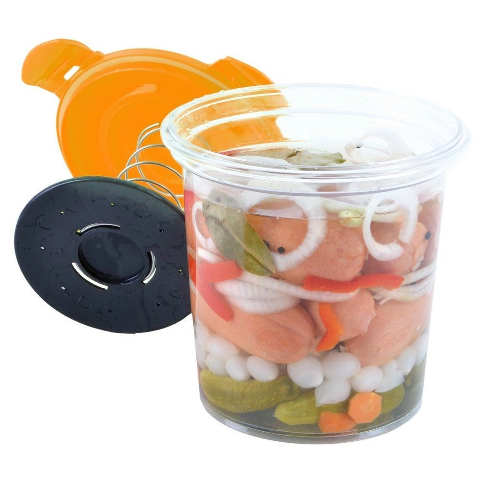 Prozorno ohišje posode omogoča hitro preverjanje poteka mariniranja ali fermentiranja brez odpiranja.