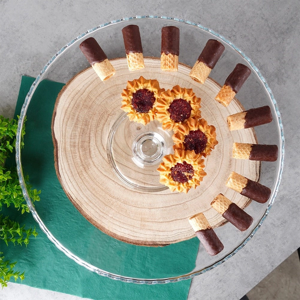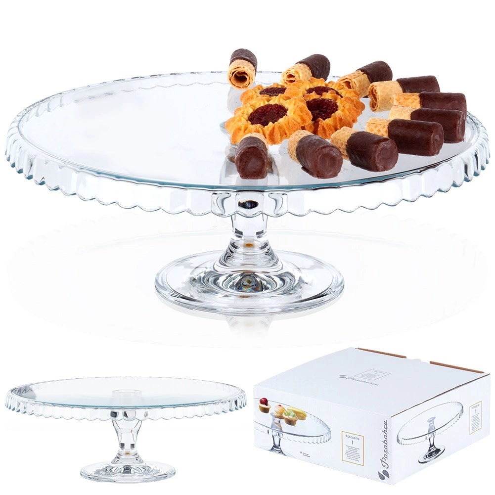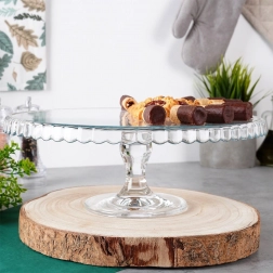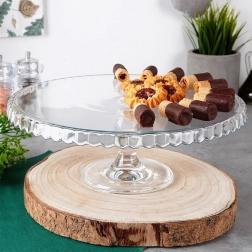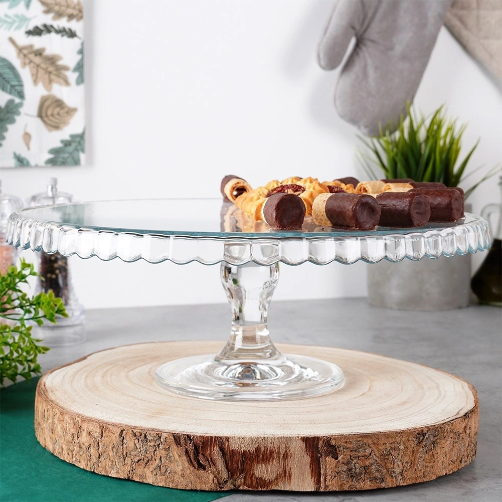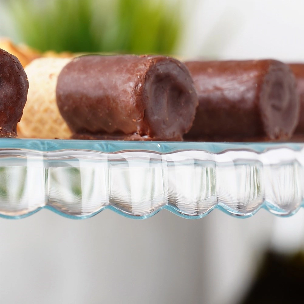 V velikem slogu predstavite torte, pite, mafine ali kanapeje. Prozorno steklo podstavka poudari barve in strukture vaših sladic, medtem ko povišana podnožna noga zagotavlja udobno rezanje in serviranje. Valovit rob doda dekorativen pridih vsaki mizi.