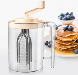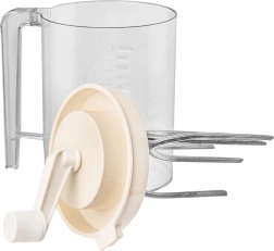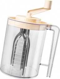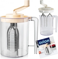 Ročni mešalnik ORION združuje stepalnik, metlico in merilni vrč v enem. Prozorna posoda z lestvico (100–1000 ml ter 1/4, 1/2, 3/4, 1 l) olajša natančno doziranje sestavin. Mehanska ročica poganja notranje metlice, zato mešate učinkovito, brez potrebe po elektriki in brez škropljenja zahvaljujoč zaprtemu pokrovu.