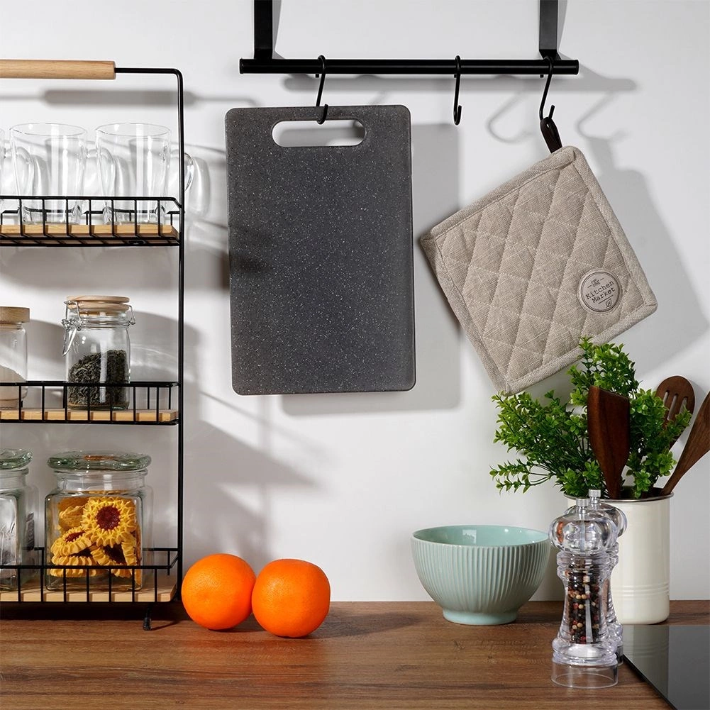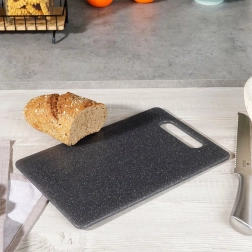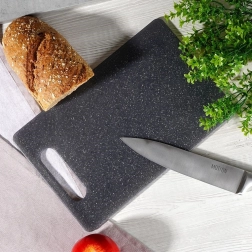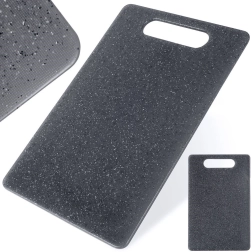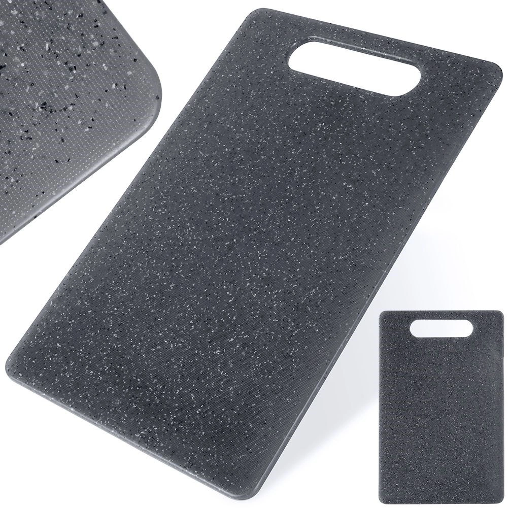Univerzalna plastična deska za rezanje živil z merami 31 × 20 cm je zanesljiv pomočnik v vsaki kuhinji. Trpežen material v sivi barvi z “granitnim” učinkom je prijazen do nožev, primeren tudi za keramična rezila, hkrati pa odporen proti običajni obrabi.