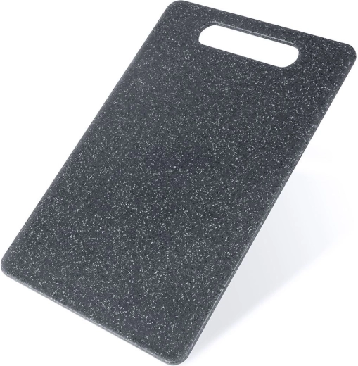 Praktična siva rezalna deska dimenzij 37 × 24 cm za vsakodnevno pripravo jedi. Izdelana iz odporne plastike z videzom kamna je zelo trpežna, ne vpija vonjav, je varna za živila in primerna za pomivalni stroj. Integriran ročaj omogoča udobno prenašanje in obešanje.