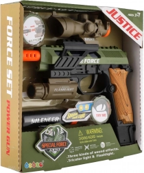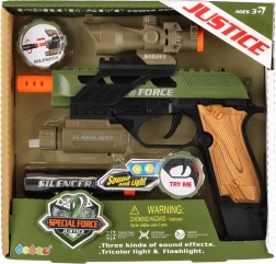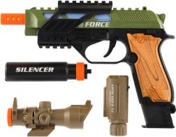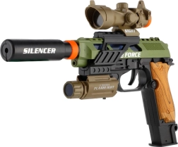 Ta plastična pištola bo razveselila vsakega malega pustolovca. Zahvaljujoč realističnemu videzu in svetlobnim ter zvočnim učinkom prinaša še več zabave in akcije v vsako igro. Priloženi so merilnik, svetloba in dušilec, ki poudarijo avtentičen vtis med igro.