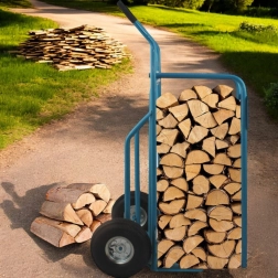 En voziček za več nalog: globoka kletka za polena in praktična šufla za škatle ali vreče. Zlahka prevaža raznolike tovore skozi dan.