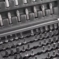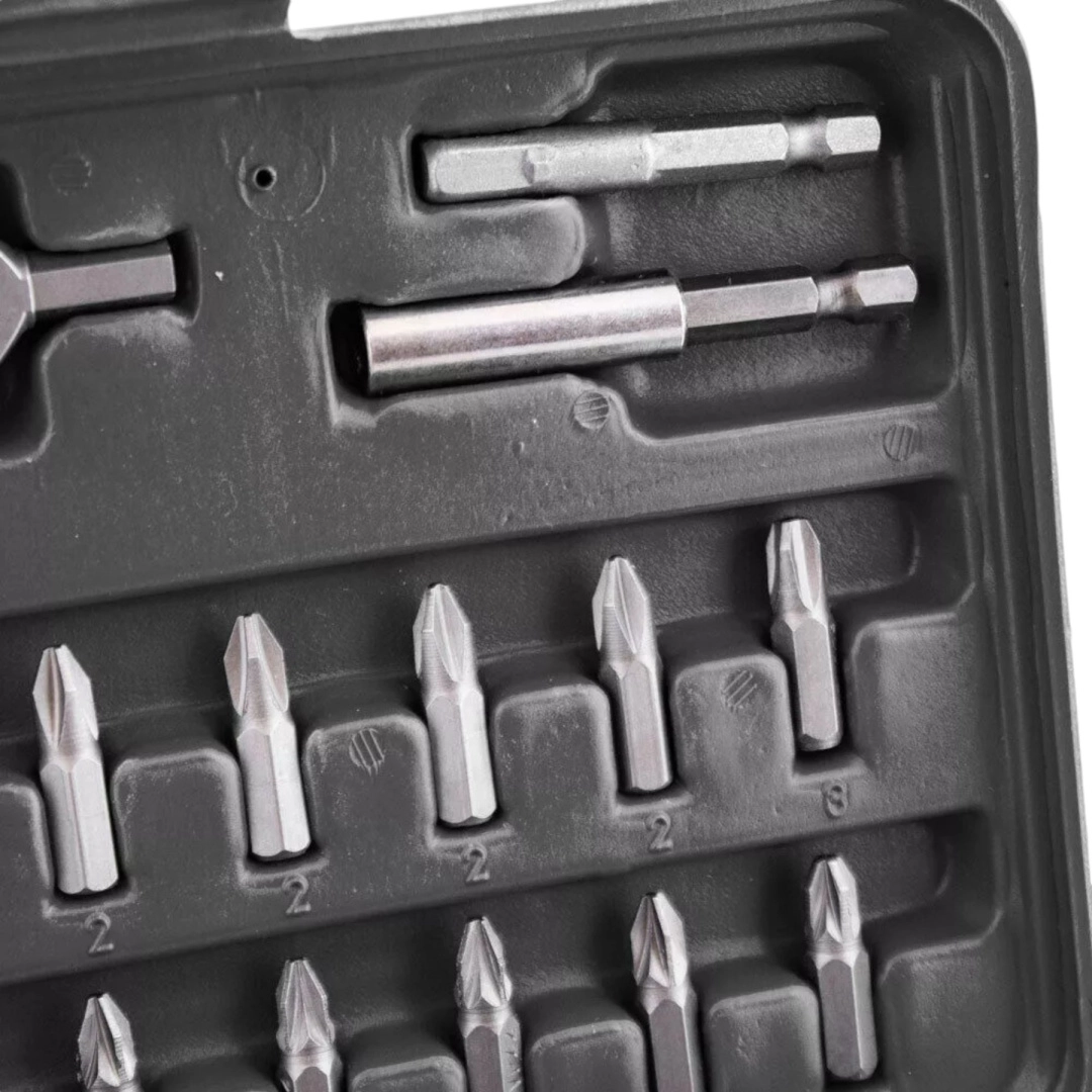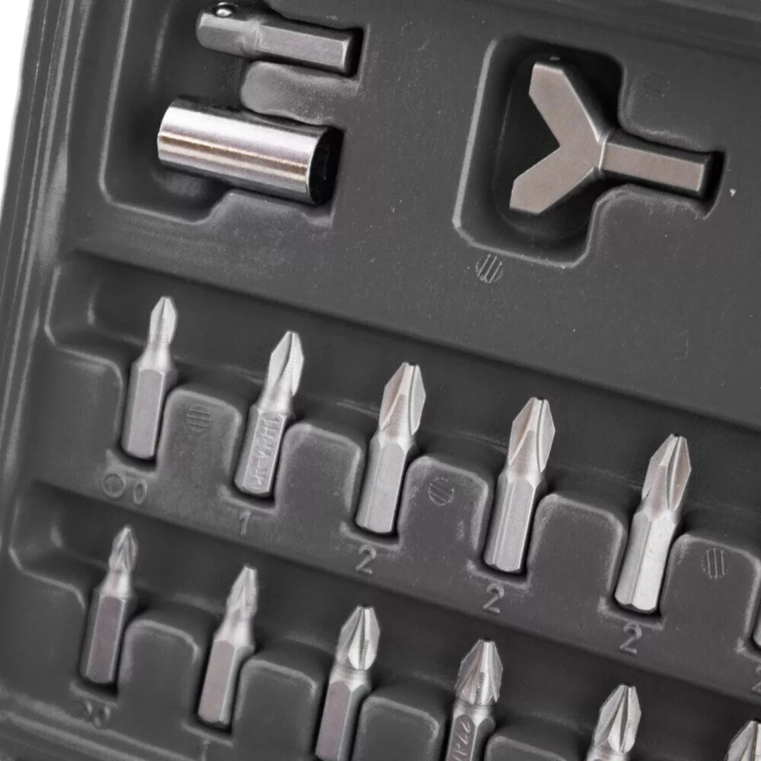 Čvrsto plastično ohišje drži vsak nastavek na svojem mestu, zato imate vedno red in hiter dostop. Zaradi kompaktnih dimenzij je set idealen za delavnico, avto in na poti.