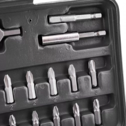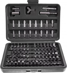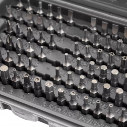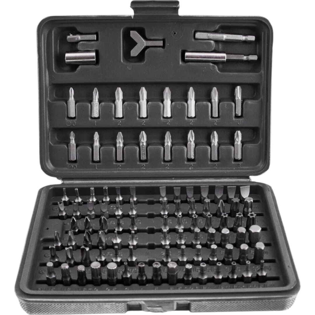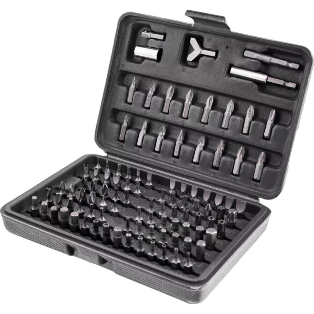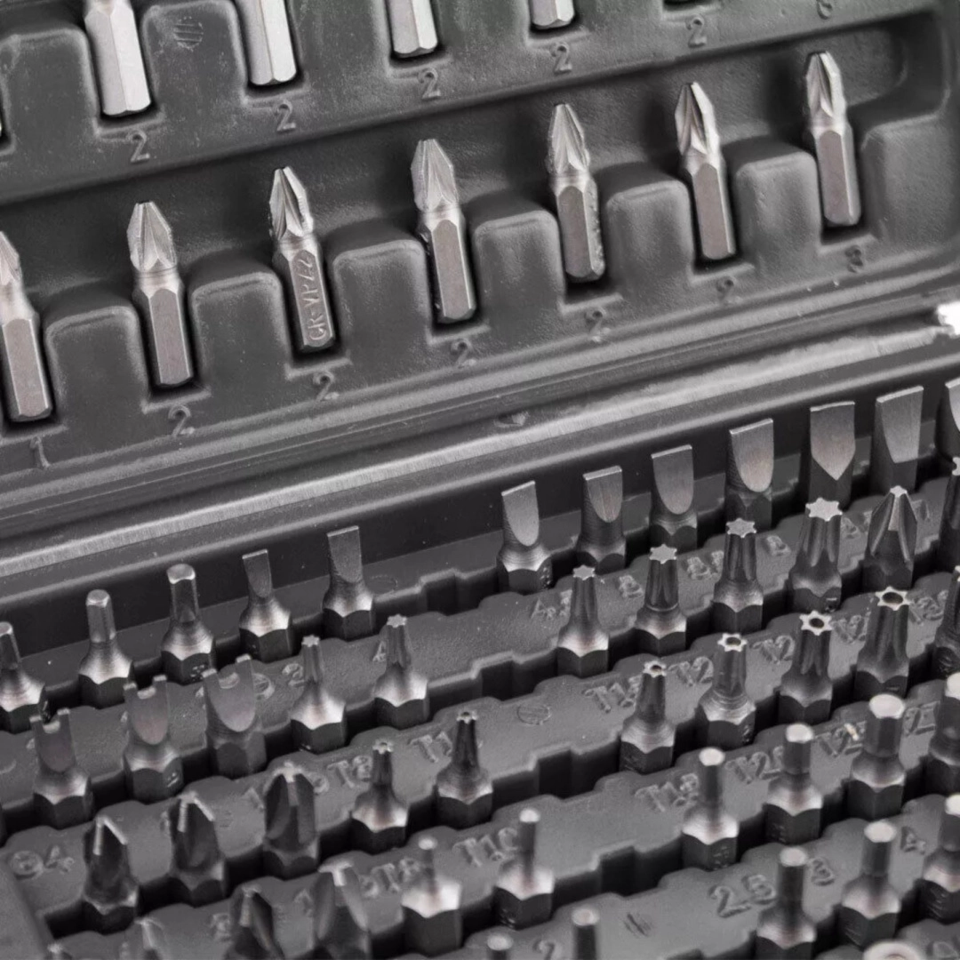 Ta celovit komplet ponuja širok nabor nastavkov – ravni, križni PH in PZ, TORX ter TORX z odprtino, metrski in colski imbusi, varnostni nastavki tipa tri‑wing, spanner, Robertson (SQ), XZN in drugi. Odporno jeklo zagotavlja dolgo življenjsko dobo in zanesljivost pri montaži, servisu in popravilih.
