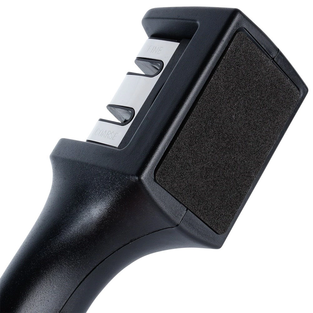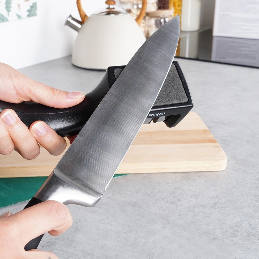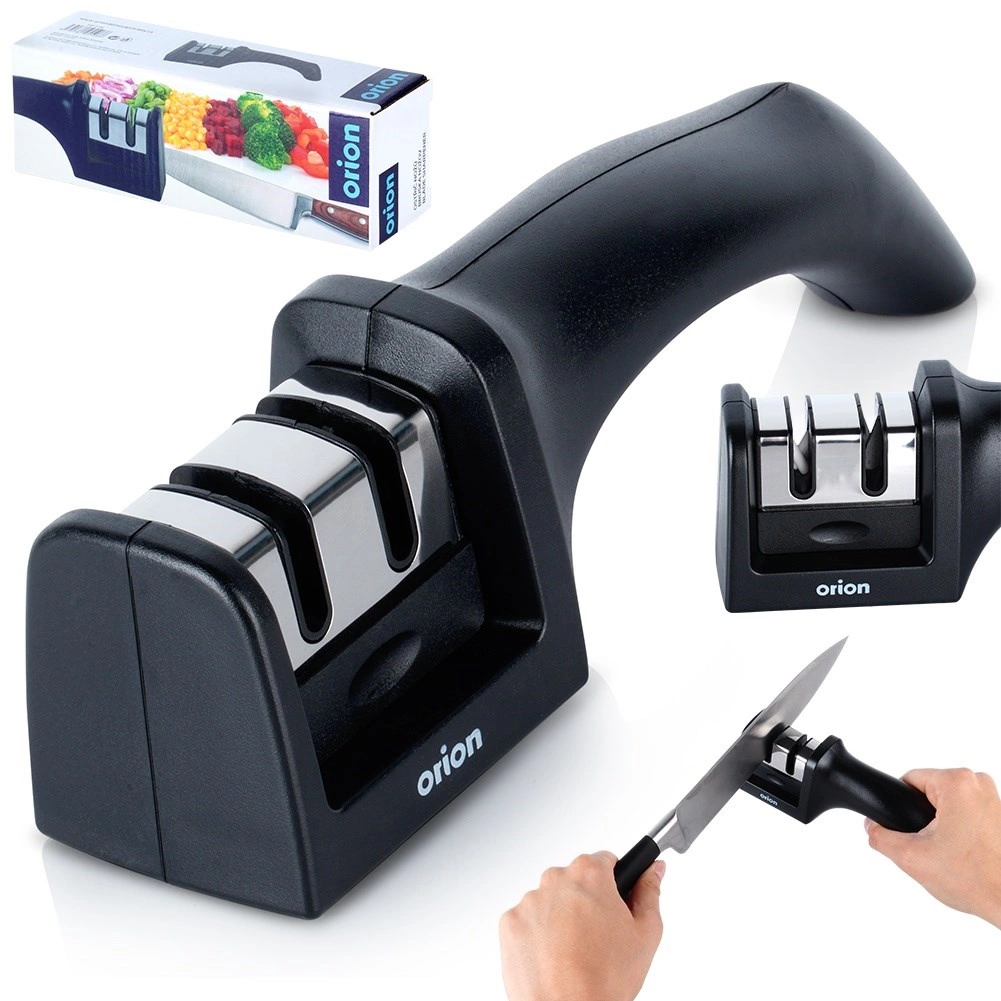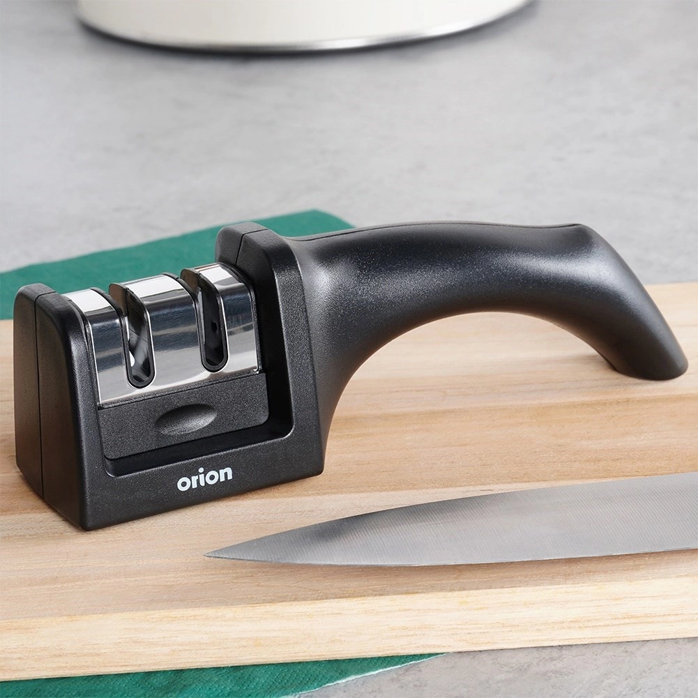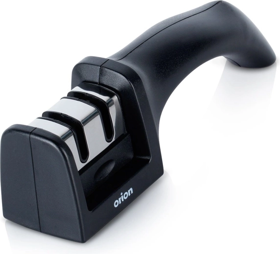 Privoščite svojim nožem natančno nego z dvofaznim brusilcem ORION. Prva stopnja s karbidno glavo hitro obnovi topo rezilo, druga stopnja s keramičnim vložkom ga nežno zgladi in spolira za dolgotrajno ostrino. Stabilna nedrseča osnova in oblikovan ročaj zagotavljata varen oprijem tudi pri večjem pritisku.