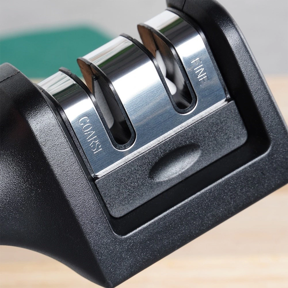 Grobi karbid obnovi obliko rezila, fina keramika ga zgladi in doostri – idealna kombinacija za vsakodnevno vzdrževanje nožev.